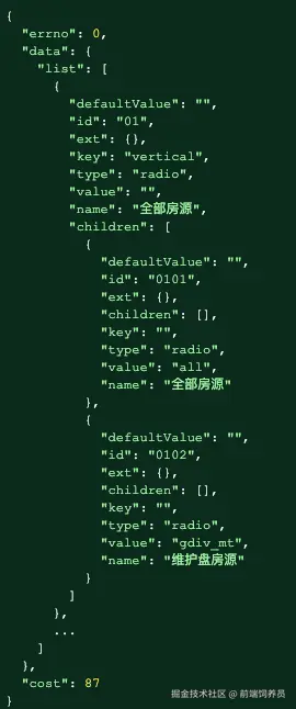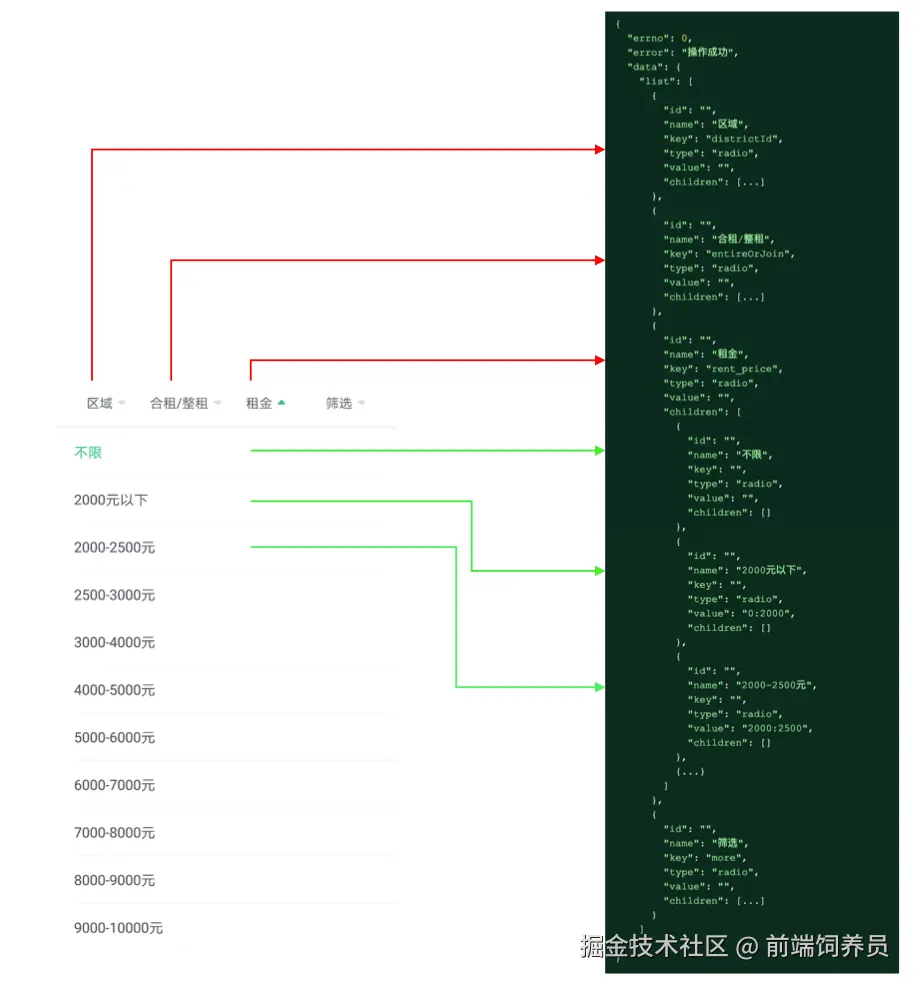 在这个筛选数据协议中,我们先看一级筛选,筛选菜单(如“租金”)内部通过 children 字段持有子筛选项列表,构成了父子层级关系、递归实现层级关系。当用户点击“2000-2500 元”的子筛选项时,筛选组件将从父级获取 key 字段的值(rent_price),并从子级获取 value 字段的值(2000:2500),返回给外部格式如下: