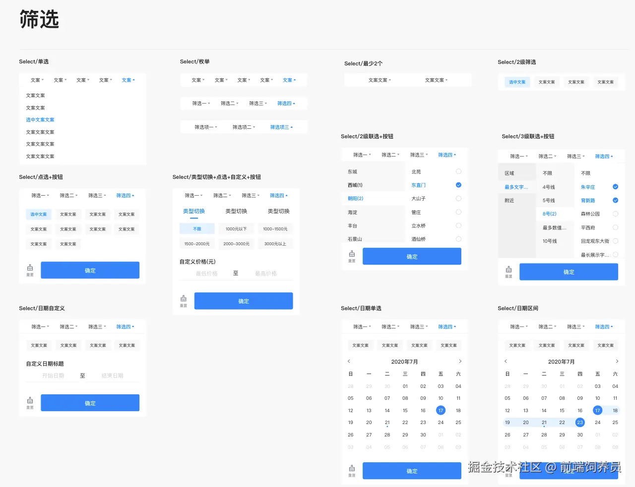 交互的源头毫无疑问是设计,因此设计团队在兼容众多业务筛选功能的情况下,规范了筛选交互如图: