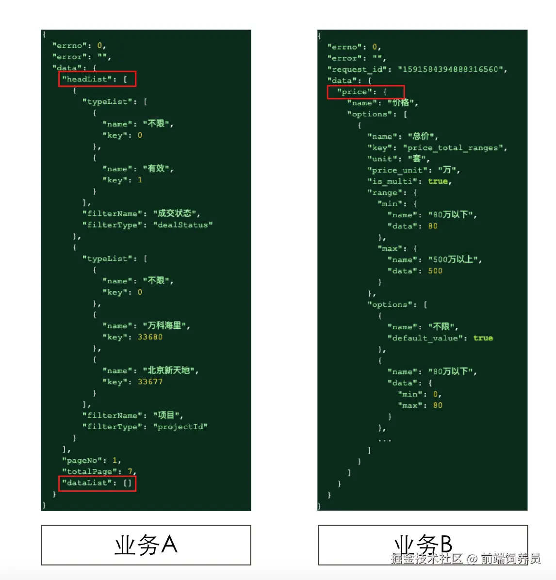 - 业务 B 中实现筛选功能需要理解筛选数据的字段含义,如字段“price”和具体的筛选项绑定,当字段变动、增加时需要重新开发,后期维护成本增加。