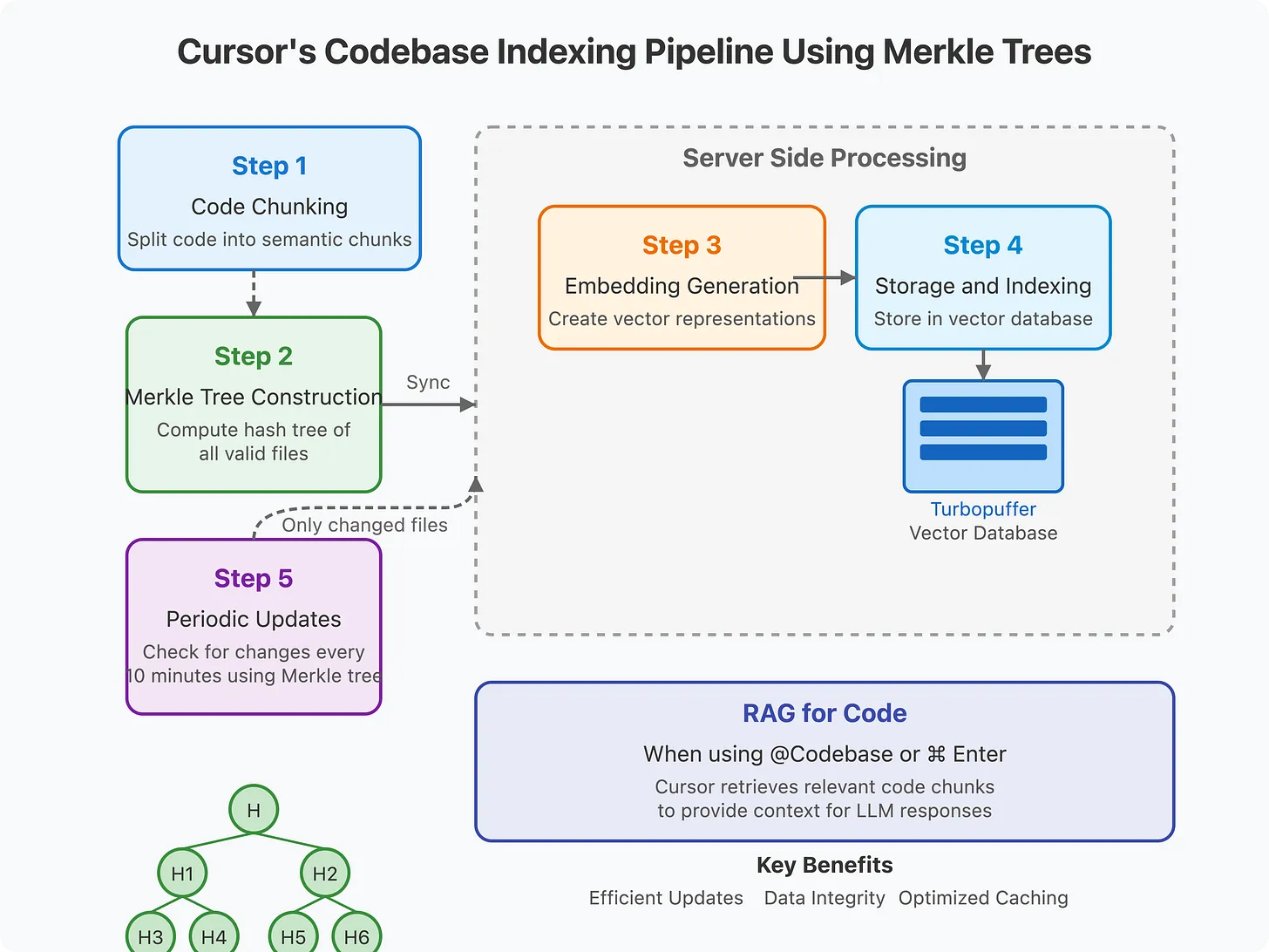 启用代码库索引时,Cursor扫描编辑器中打开的文件夹,并计算所有有效文件哈希值的Merkle树。然后将此Merkle树与Cursor的服务器同步,如Cursor的安全文档中所述。
