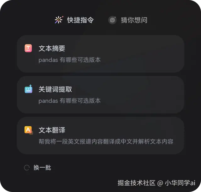 - 快捷提示条:McPrompt 提供常用场景入口,如“文本摘要”、“关键词提取”、“文本翻译”等;