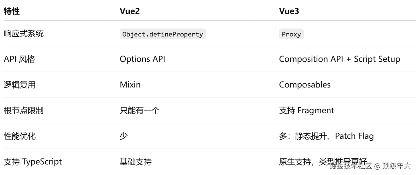 Vue3 自发布以来,带来了大量架构级升级与语法革新。本文将从核心设计、开发体验、性能优化和生态兼容性四个角度,系统讲解 Vue3 相较 Vue2 的主要变化,帮助开发者快速完成从 Vue2 向 Vue3 的过渡。