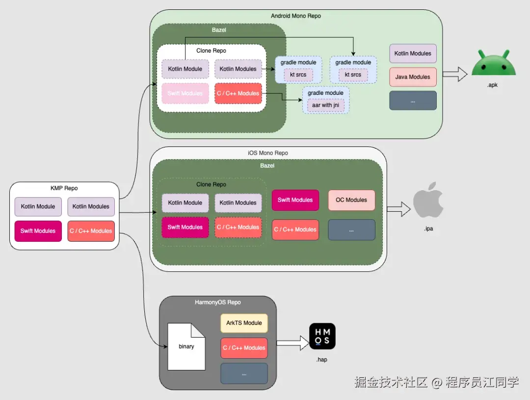 值得一提的是,B 站 KMP 工程构建系统选用 Bazel,虽失去官方原生能力,但可基于原子能力自由组合调优,实现多语言混编、依赖注入与分模块导出等功能。