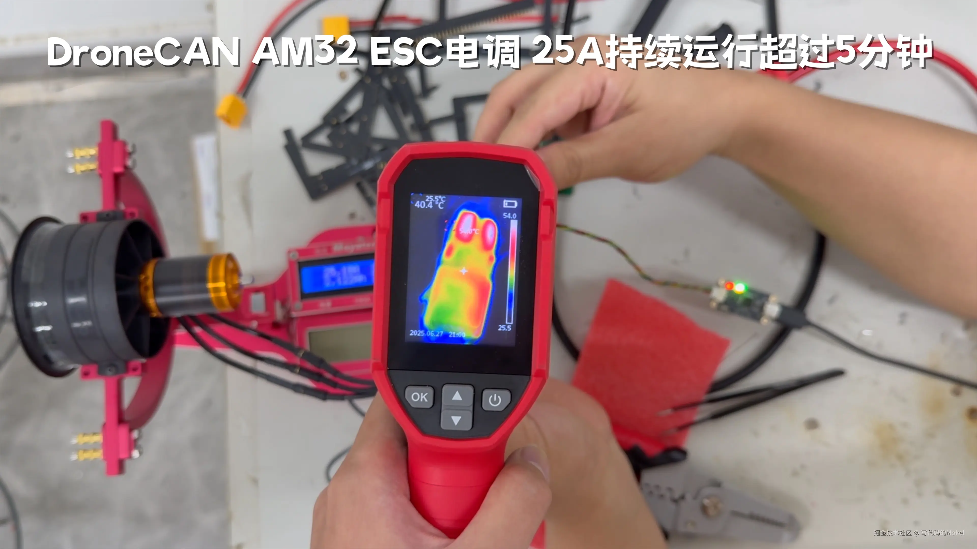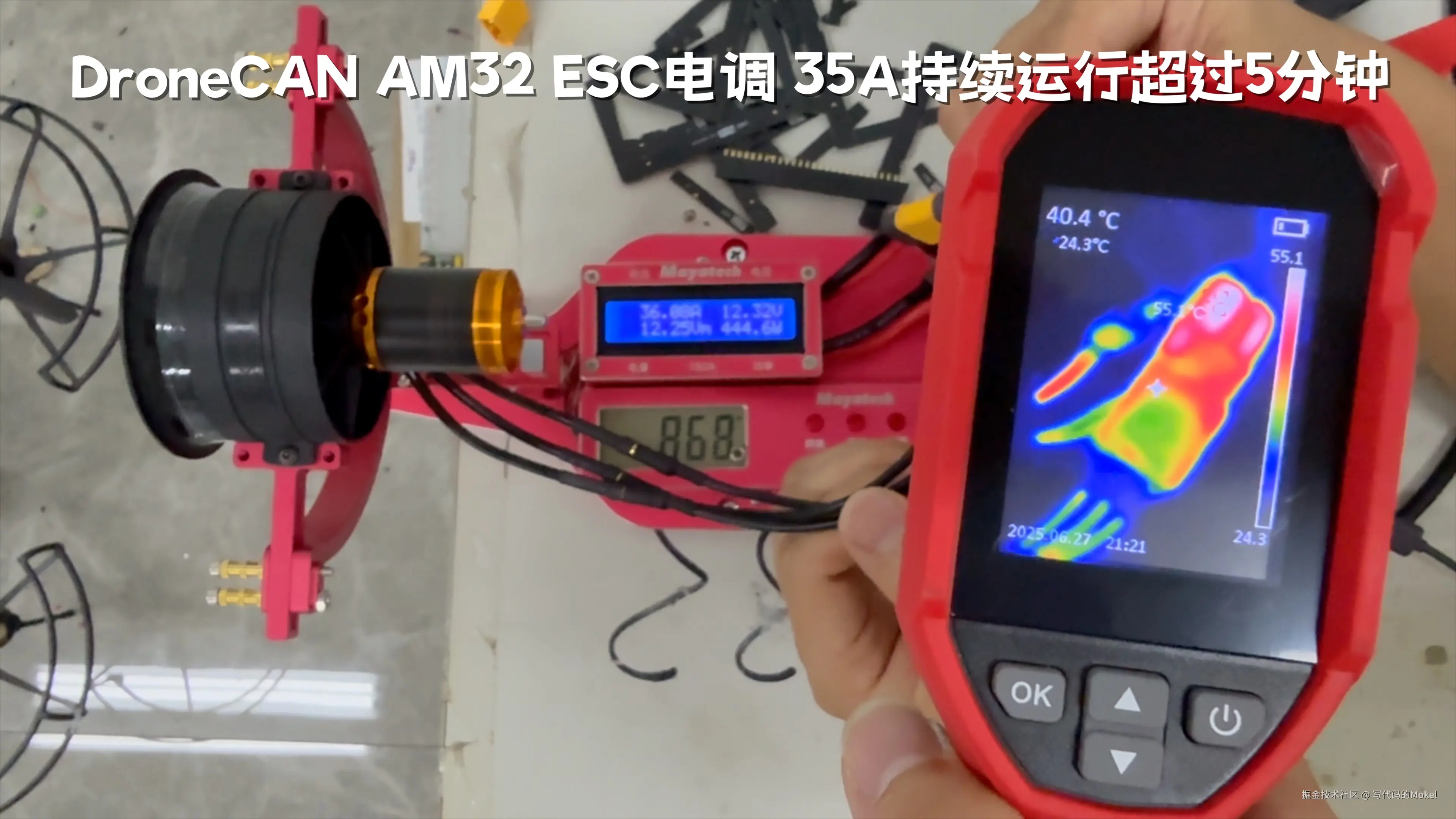 首先,我们总结一下测试结果,我手上这款6S 40A的DroneCAN AM32电调,配套3S 4300KV 6P涵道电机,环境温度24度并且涵道风力直吹散热,在40A工作电流情况下,持续运转超过5分钟,温度稳定在,传感器温度92摄氏度,测温仪实测表面最高温度(电容)54摄氏度。