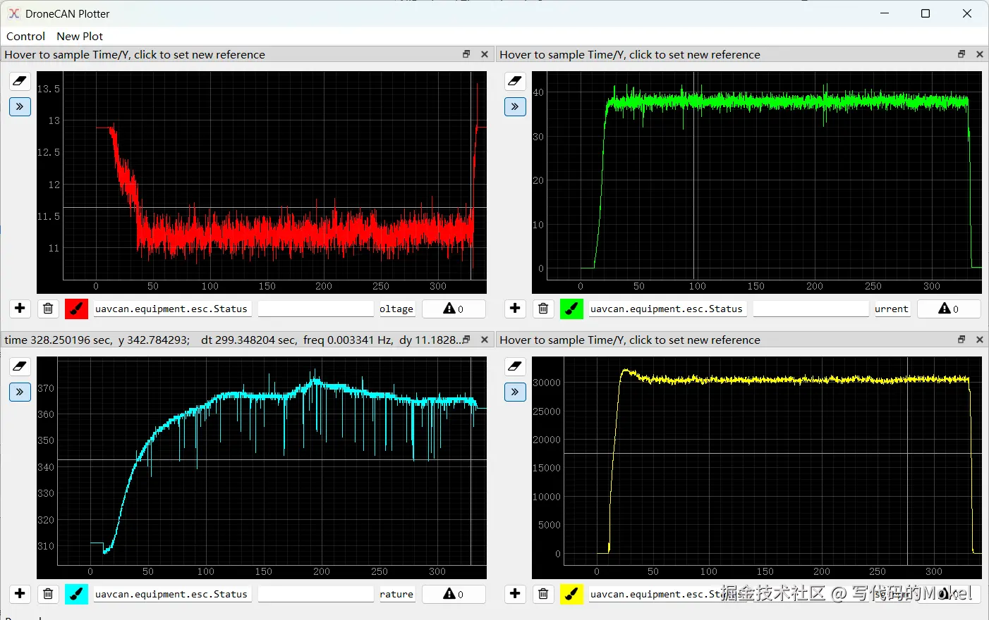 这款Pogo-DroneCAN AM32 ESC电调出厂设置了电流保护40A、温度保护120摄氏度的参数,这个温度指的是传感器温度,所谓保护,指的是电调会自动调整油门,主要是减小油门,来控制电调工作电流维持在40A左右,或者控制电调发热温升不大于120摄氏度。