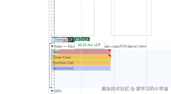 - 存在问题:时序性问题,这个API返回的是已经记录的性能条目,但如果过早地调用它,例如在DOMContentLoaded事件处理函数中,可能无法获取到FCP的值,因为此时FCP可能还没有发生。