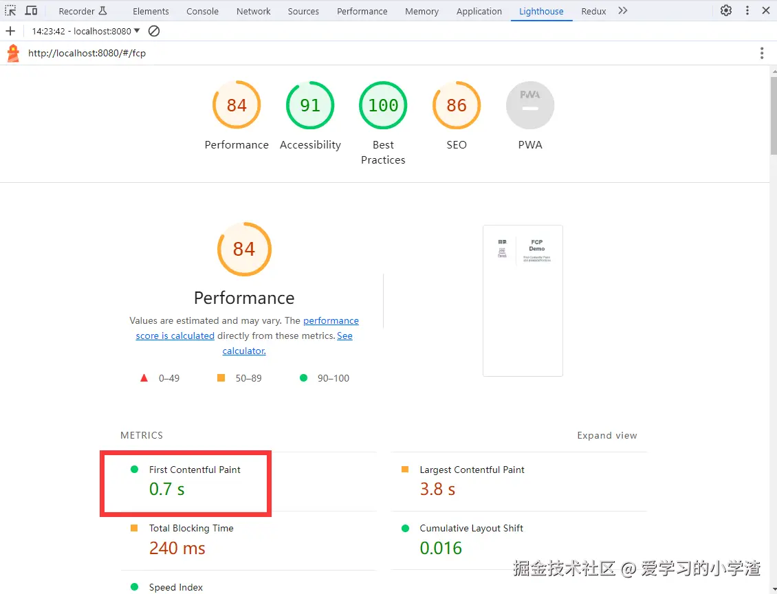 First contentful paint 首次内容绘制 (FCP):页面开始加载到页面显示任何内容的时间。 首次绘制DOM内容的时间,内容必须是文本、图片、非白色的canvas或svg等。这个指标通常会被用来衡量白屏时间。