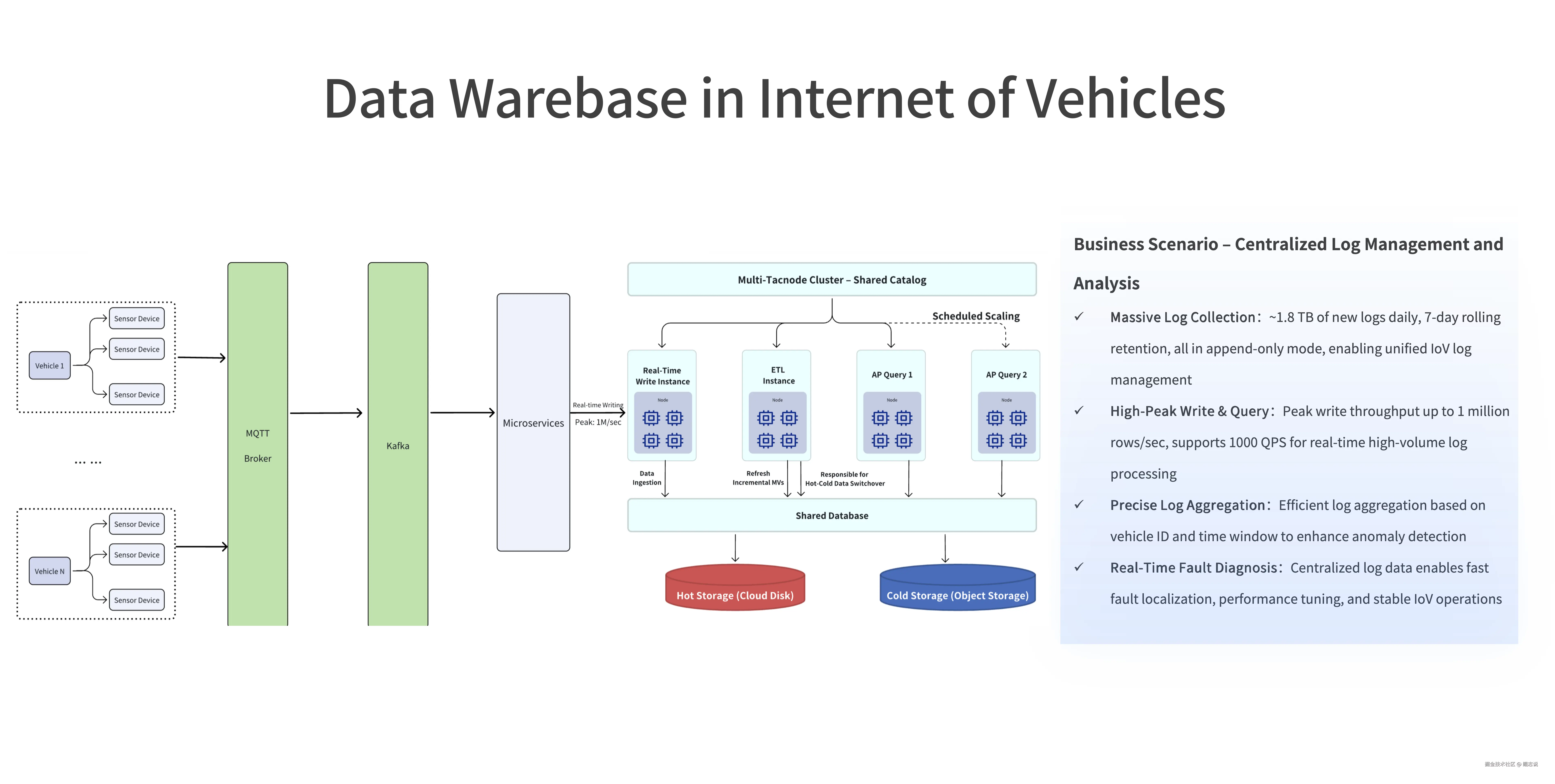 车联网安全监控实现秒级预警重构 。 面对百万辆电动车每秒涌入的百万条车机信号,某头部车联网企业遭遇监管存储与安全监控的双重夹击——传统架构下核心信号异常监控延迟高达数分钟,而热失控等风险的响应窗口不足 10 秒。通过 ProtonBase 的 Data Warebase 范式,该企业以实时增量物化视图引擎实现秒级数据加工及风险诊断,在统一架构内同步完成历史数据合规存储与关键信号扫描,终结双系统割裂时代。