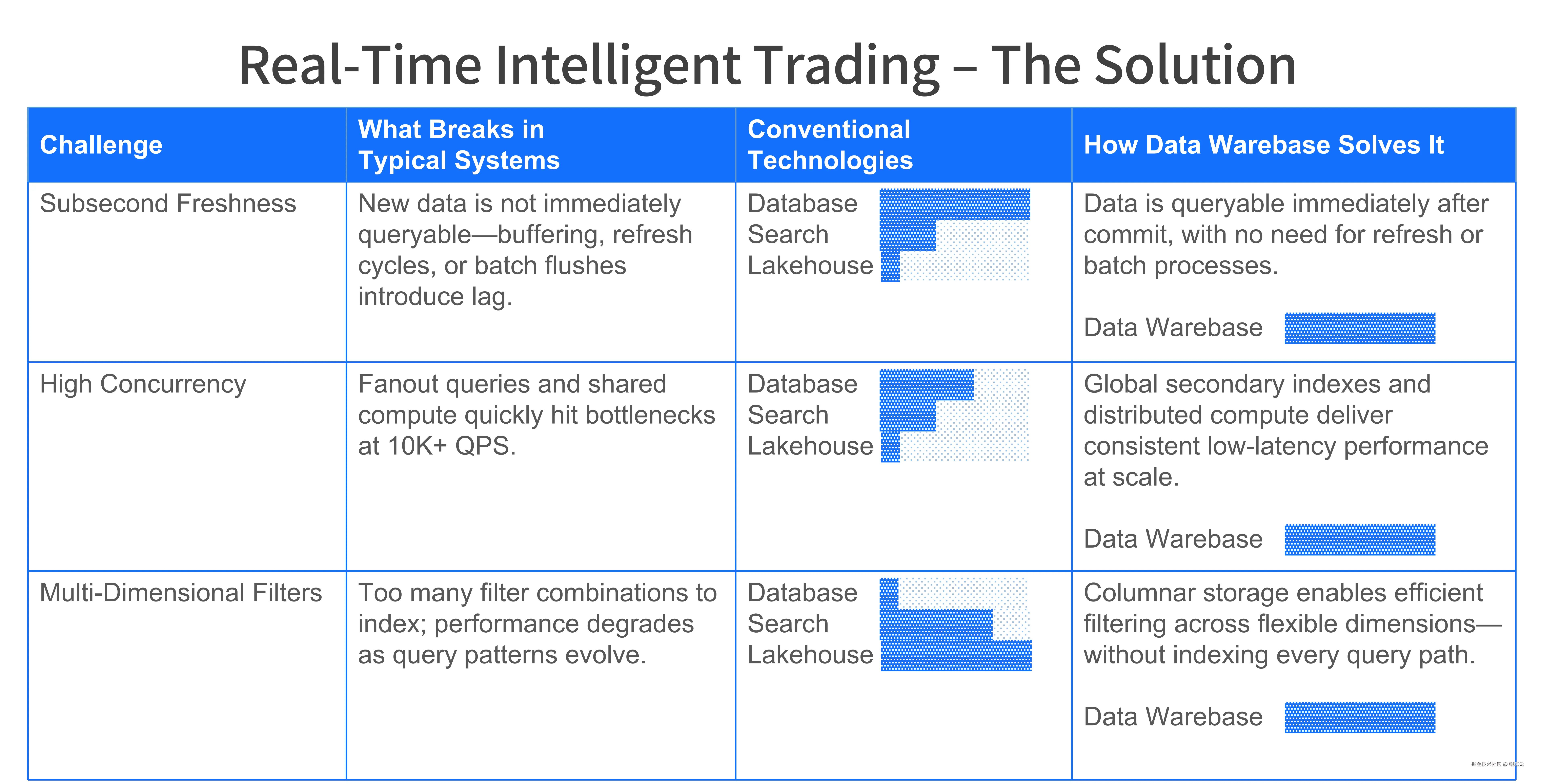 当 Data Warebase 打破数据架构领域持续数十年的 “不可能三角”,商业世界的价值裂变已然在真实战场爆发——从金融领域的量化交易和实时风控,到车机数据每秒更新并即时进行规则匹配和安全分析...... 技术范式跃迁正沿着三重坐标轴撕开万亿市场的豁口: