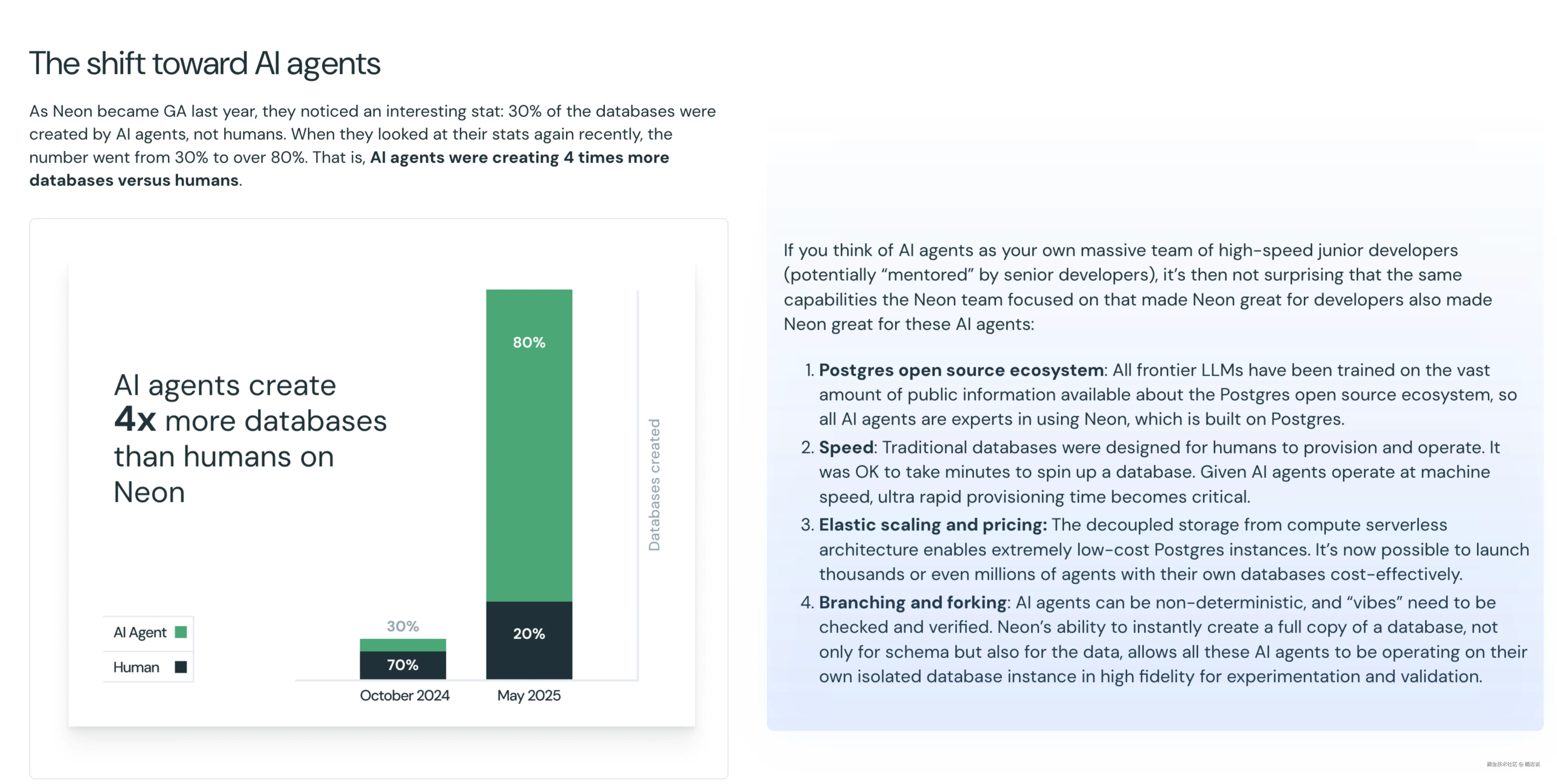 从 2024 年 10 月到 2025 年 5 月,短短七个月内,AI Agent 创建的数据库数量从 30% 爆涨至 80%,远超人类工程师的工作产出。与此同时,Databricks 以 10 亿美元收购 Neon 的消息震动业界——这家人工智能巨头正在用真金白银抢占下一代数据基础设施入口。