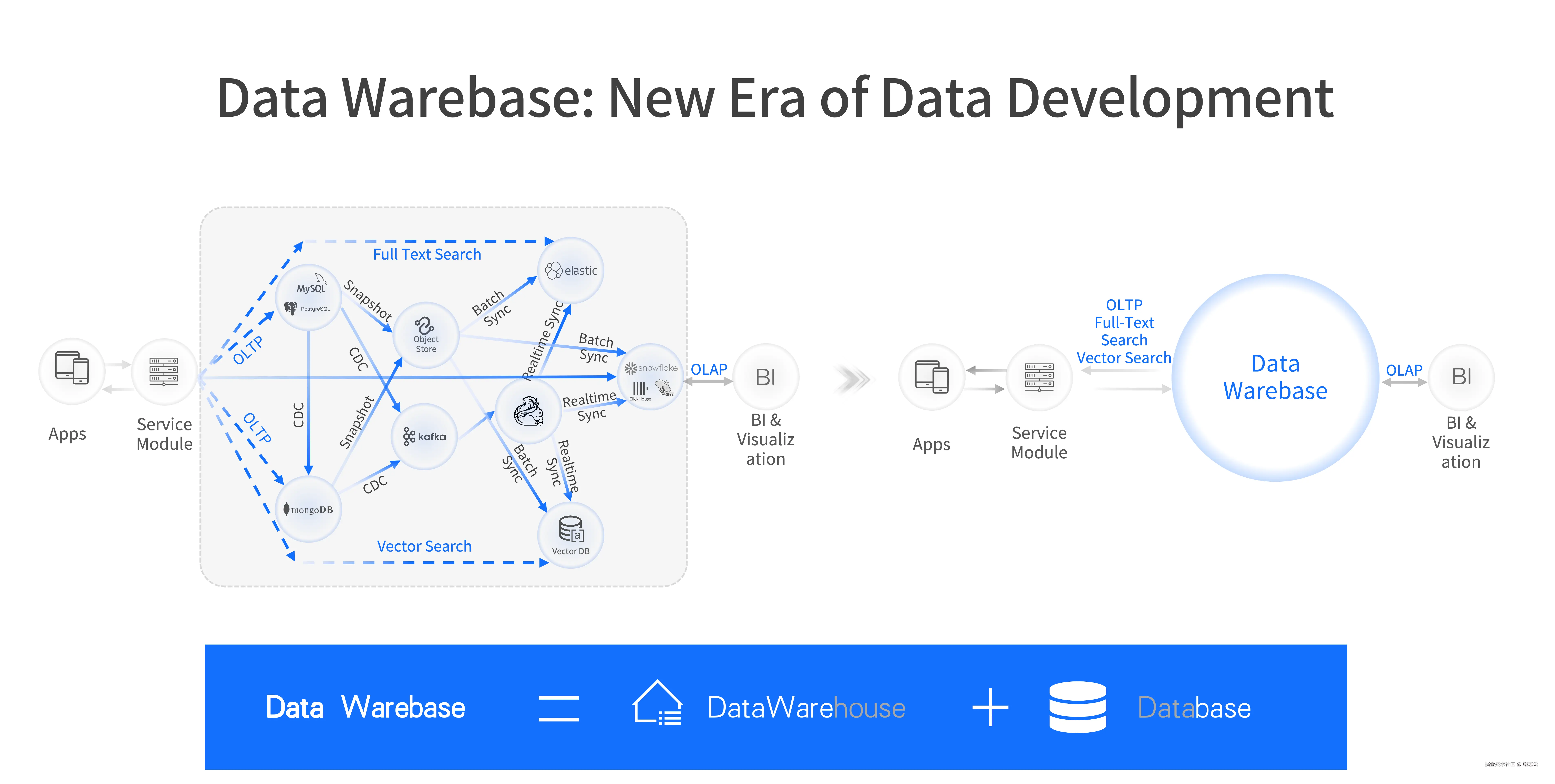Data Warebase 的概念是将 Data Warehouse 与 Database 融合于一体,构建统一的数据底座,以全面支撑 AI 工作流中从数据高吞吐写入、实时加工、高频的分析和检索的全过程。