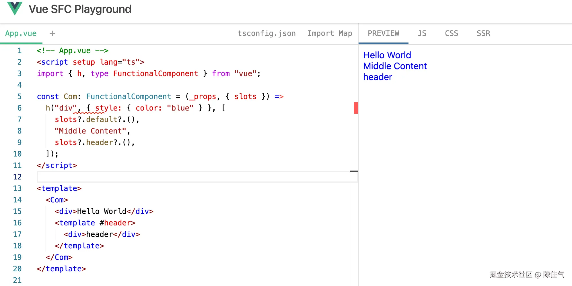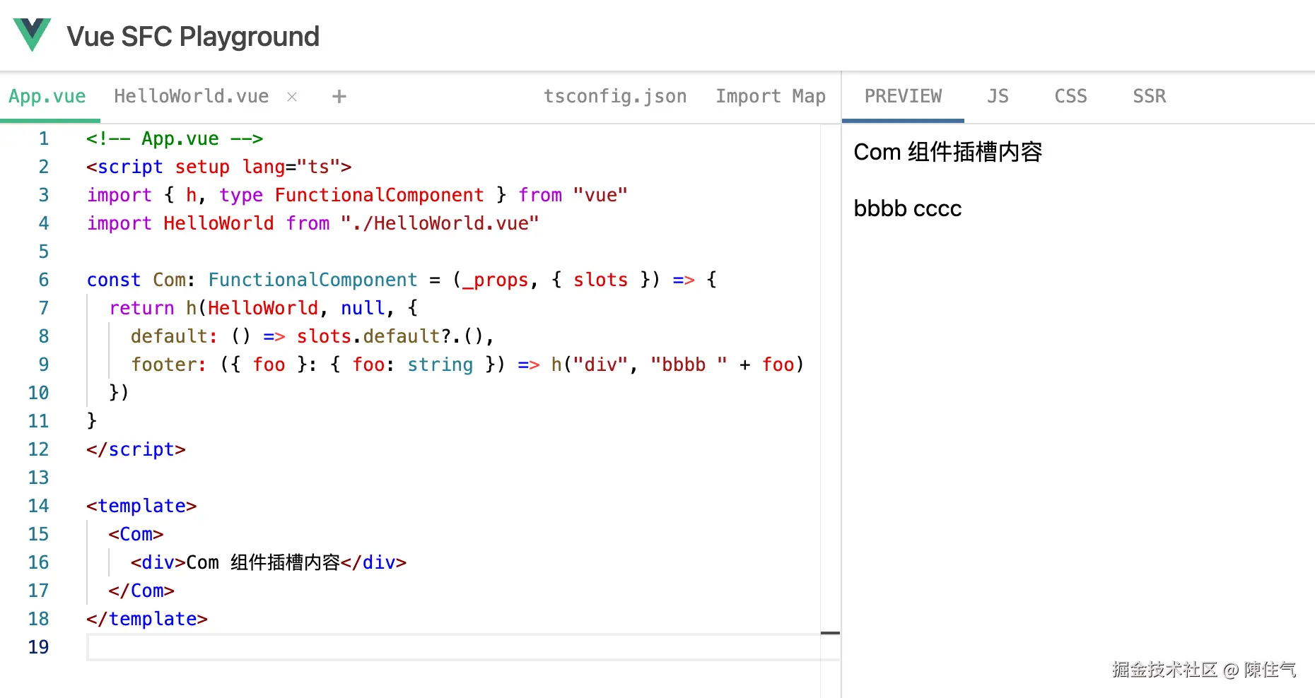 我们可以将 Com 理解为一个 setup 函数,所以可以从第 2 个参数里获取到 slots: