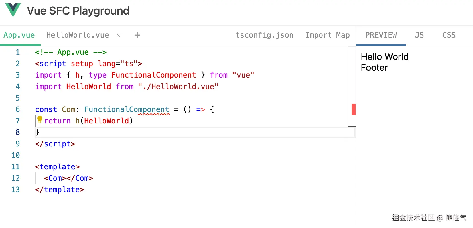 在学习 h 函数后,如果你在某些业务场景厌倦使用 Template 的组件编写方式, 完全可以在 Vue 中像 React 那样,以函数式的编程方式来编写组件(不依赖 JSX 插件)。