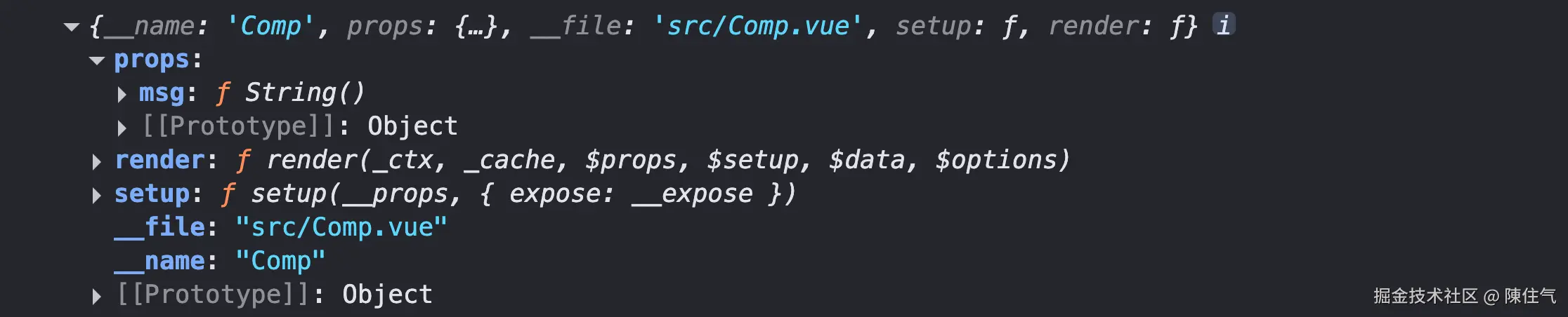 如下图所示, Vue 中的组件经过编译后其实就是一个对象,对象中的 props 属性对应的就是我们写的 defineProps, 而对象中的 setup 方法,对应的就是我们熟知的 <script setup> 语法糖。