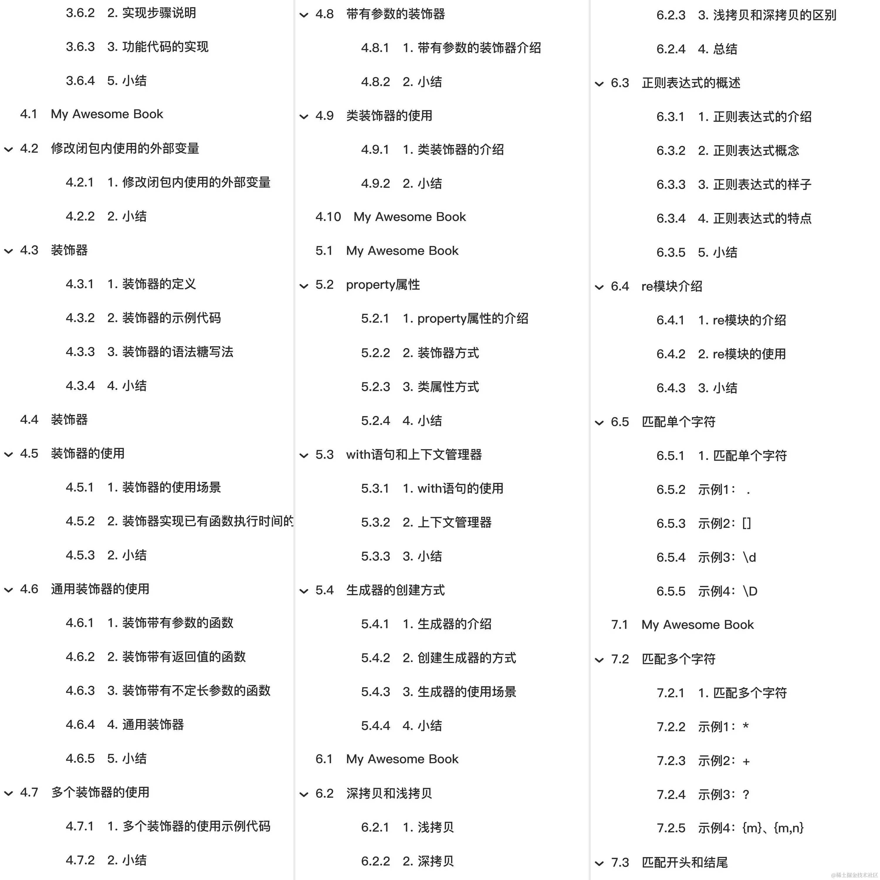 教程总体简介:My Awesome Book 操作系统 1. 常见的操作系统 2. 操作系统的定义 4. 小结 虚拟机软件 1. 虚拟机软件的介绍 Ubuntu操作系统 2. Ubuntu图形界面的介绍 3. 与Windows目录结构对比 Linux内核及发行版 1. Linux内核 查看目录命令 1. 查看目录命令的使用 2. 查看当前目录路径 3. 清除终端内容 绝对路径和相对路径 1. 绝对路径 4. 自动补全 创建、删除文件及目录命令 终端命令格式的组成 1. 终端命令格式说明 查看命令帮助 静态Web服务器-返回固定页面数据 1. 开发自己的静态Web服务器 静态Web服务器-命令行启动动态绑定端口号 1. 开发命令行启动动态绑定端口号的静态web服务器 闭包 2. 闭包的构成条件 3. 简单闭包的示例代码 4. 闭包的作用 闭包的使用 1. 案例 2. 实现步骤说明 3. 功能代码的实现 修改闭包内使用的外部变量 装饰器 1. 装饰器的定义 3. 装饰器的语法糖写法 装饰器的使用 2. 装饰器实现已有函数执行时间的统计 带有参数的装饰器 property属性 3. 类属性方式 with语句和上下文管理器 1. with语句的使用 2. 上下文管理器 生成器的创建方式 2. 创建生成器的方式 3. 生成器的使用场景 深拷贝和浅拷贝 1. 浅拷贝 3. 浅拷贝和深拷贝的区别 正则表达式的概述 2. 正则表达式概念 re模块介绍 2. re模块的使用 匹配单个字符 示例1: . 示例2:[] 示例3:\d 小结 匹配开头和结尾 示例3:^ 和 $ 2.除了指定字符以外都匹配 4. 课下练习 匹配分组 1. 匹配分组相关正则表达式 示例4:(?P<name>) (?P=name) ls命令选项 mkdir和rm命令选项 1. mkdir命令选项 2. rm命令选项 cp和mv命令选项 重定向命令 查看文件内容命令 链接命令 2. 软链接 5. 硬链接小结 文本搜索命令 3. grep命令结合正则表达式的使用 压缩和解压缩命令 2. tar命令及选项的使用 3. zip和unzip命令及选项的使用 文件权限命令 1. chmod命令的介绍 获取管理员权限的相关命令 2. whoami命令的使用 5. passwd命令的使用 用户相关操作 1. 创建用户 2. 设置密码 远程登录、远程拷贝命令 3. FileZilla软件的使用 编辑器 vim 2. vim 的工作模式 软件安装 2. deb文件格式安装 3. apt-get方式安装 4. 更改镜像源 软件卸载 多任务的介绍 2. 多任务的概念 进程 多进程的使用 1 导入进程包 2. Process进程类的说明 3. 多进程完成多任务的代码 获取进程编号 1. 获取进程编号的目的 3. 获取当前父进程编号 进程执行带有参数的任务 3. kwargs参数的使用 进程的注意点 2. 进程之间不共享全局变量 4. 主进程会等待所有的子进程执行结束再结束 线程 互斥锁 1.互斥锁的概念 4. 使用互斥锁完成2个线程对同一个全局变量各加100万次的操作 死锁 2. 死锁示例 3. 避免死锁 进程和线程的对比 1. 进程和线程的对比的三个方向 2. 关系对比 3. 优缺点对比 协程 协程是啥 协程的优点 gevent 安装 1. gevent的使用 3. 给程序打补丁 IP 地址的介绍 2. IP 地址的表现形式 3. 查看 IP 地址 4. 检查网络是否正常 端口和端口号的介绍 1. 问题思考 2. 什么是端口 5. 端口号的分类 TCP 的介绍 1. 网络应用程序之间的通信流程 3. TCP 的特点 socket 的介绍 4. socket 使用场景 TCP 网络应用程序开发流程 2. TCP 客户端程序开发流程的介绍 TCP服务端程序开发 1. 开发 TCP 服务端程序开发步骤回顾 socket之send和recv原理剖析 1. 认识TCP socket的发送和接收缓冲区 2. send原理剖析 HTTP 协议 3. 浏览器访问web服务器的通信过程 URL 2. URL的组成 查看HTTP协议的通信过程 1. 谷歌浏览器开发者工具的使用 HTTP响应报文 2. HTTP 状态码介绍 搭建Python自带静态Web服务器 1. 静态Web服务器是什么?
