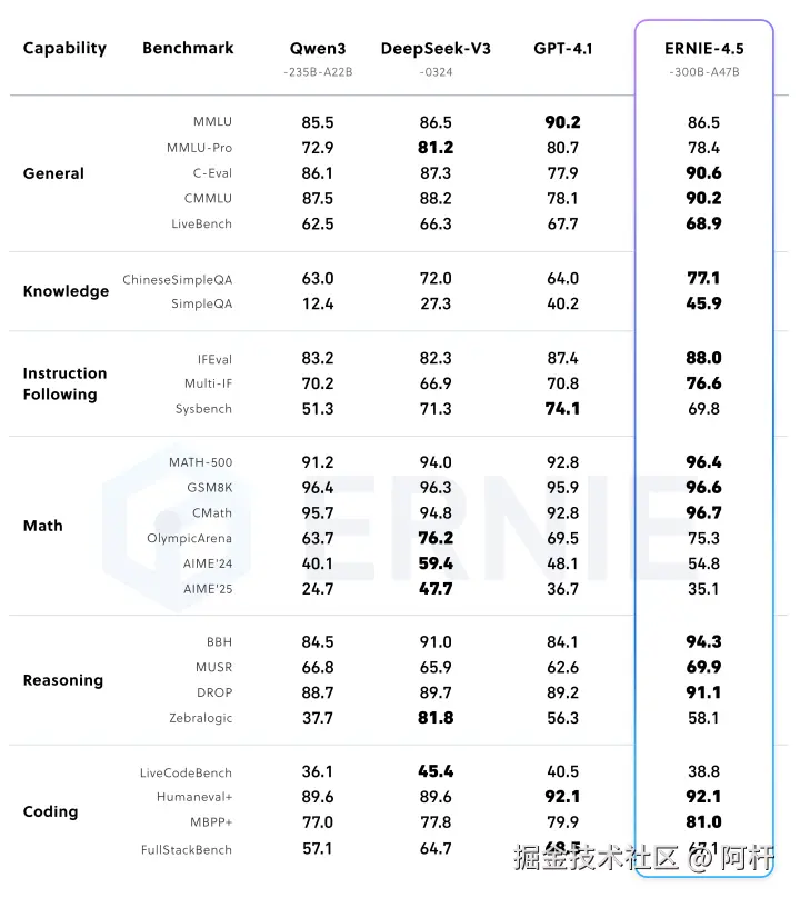 - 文心4.5的主力选手,在多个基准测试中超越了 DeepSeek-V3、Qwen3、GPT4.1 等同量级模型;