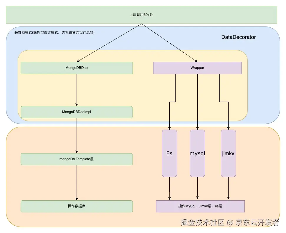 采用装饰器模式,统一控制双写逻辑(主写,辅写),统一控制切量逻辑,下线逻辑, 抽取代码中原有的直接调用底层mongodb API的代码,将其不改业务逻辑的情况下迁移到Dao层。这样做的目的是为了后续做切流适配逻辑。不改逻辑及出入参的目的是为了避免对当前业务造成影响。