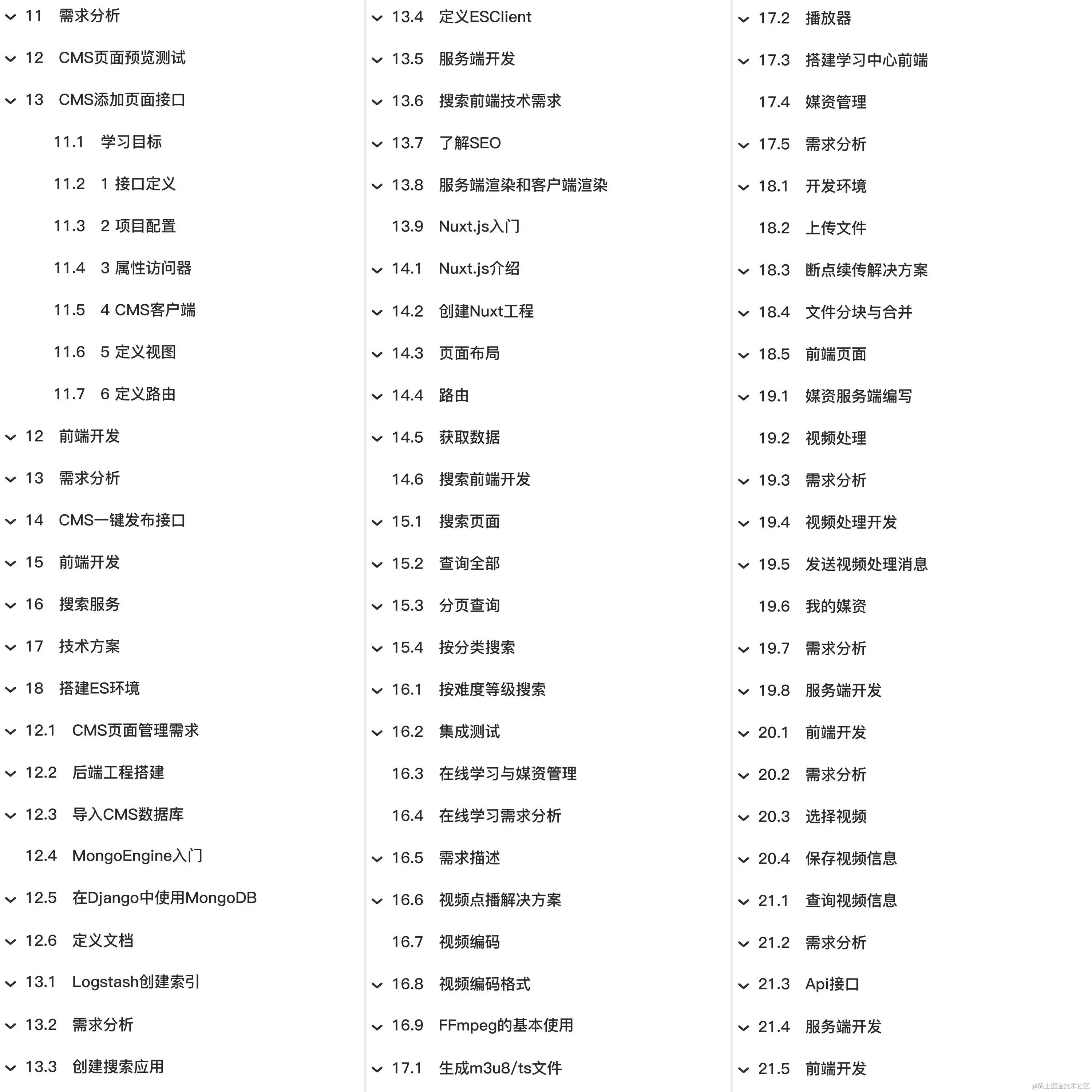 教程总体简介:项目概述 项目背景 项目的功能构架 项目的技术架构 CMS 什么是CMS CMS需求分析与工程搭建 静态门户工程搭建 SSI服务端包含技术 页面预览开发 4 添加“页面预览”链接 页面发布 需求分析 技术方案 测试 环境搭建 数据字典 服务端 前端 数据模型 页面原型 前端页面 上传图片开发 前端开发 图片查询 静态页面测试 CMS页面预览测试 CMS添加页面接口 搜索服务 搭建ES环境 后端工程搭建 导入CMS数据库 MongoEngine入门 在Django中使用MongoDB 定义文档 Logstash创建索引 创建搜索应用 定义ESClient 搜索前端技术需求 了解SEO 服务端渲染和客户端渲染 Nuxt.js入门 创建Nuxt工程 页面布局 路由 获取数据 搜索页面 查询全部 分页查询 按分类搜索 按难度等级搜索 集成测试 在线学习与媒资管理 在线学习需求分析 需求描述 视频点播解决方案 视频编码 FFmpeg的基本使用 生成m3u8/ts文件 播放器 搭建学习中心前端 媒资管理 开发环境 上传文件 断点续传解决方案 文件分块与合并 媒资服务端编写 视频处理 发送视频处理消息 我的媒资 选择视频 保存视频信息 Api接口 学习页面获取视频播放地址 在线学习接口 登录注册与认证授权 增加数据 修改数据 删除数据 查询数据 Q对象 其他 查询集 QuerySet 页面管理后端开发 接口说明 接口开发规范 JWT Django REST framework JWT 用户登录前端 前端显示当前用户 用户退出 前端集成认证授权 用户注册后端 订单与选课 分布式事务 问题描述 CAP理论 解决方案 自动添加选课方案 Celery Beat定时任务 订单服务定时发送消息 查询前N条任务 乐观锁取任务 RabbitMQ配置 学习服务添加选课 订单服务结束任务 传智云课堂 封装异常处理 封装JSON返回值 站点列表和模板列表接口 新增页面 页面查询接口定义 自定义条件查询 3 测试接口 页面详情 修改页面 删除页面 CMS前端工程创建 导入系统管理前端工程 单页面应用介绍 CMS前端页面查询开发 创建页面 Table组件测试 页面内容完善 跨域问题解决 进入页面立即查询 前后端请求响应流程小结 新增页面前端开发 页面处理流程 页面静态化及预览发布 页面静态化需求 模板管理 模板管理业务流程 模板制作 GridFS研究 模板存储