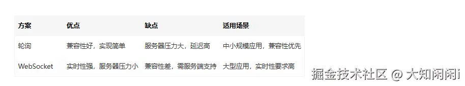 “轮询实现简单但服务器压力大,WebSocket 实时性好但兼容性差。实际项目中可采用 WebSocket 为主,轮询为降级方案。” -