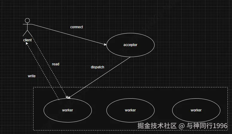 - selector在接受到连接请求后,会将对应的client socket channel分配给一个worker,即在该worker的selector上注册读写事件监听,并摘除自身selector上对该channel的accept事件关注。