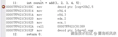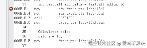 注意寄存器与栈是两片独立运行的区域,光从汇编代码,很容易陷入误区,就拿上图来说,从上往下阅读汇编,你会发现参数传递的顺序是30(1Eh),40(28h),50(32h),10(0Ah),20(14h)。明显不对,这是因为一个是寄存器,一个是线程栈,这是两个不相关的区域,谁前谁后都不违反从左到右的规定。不能死脑筋,寄存器与栈之间是存在位置无关性的。