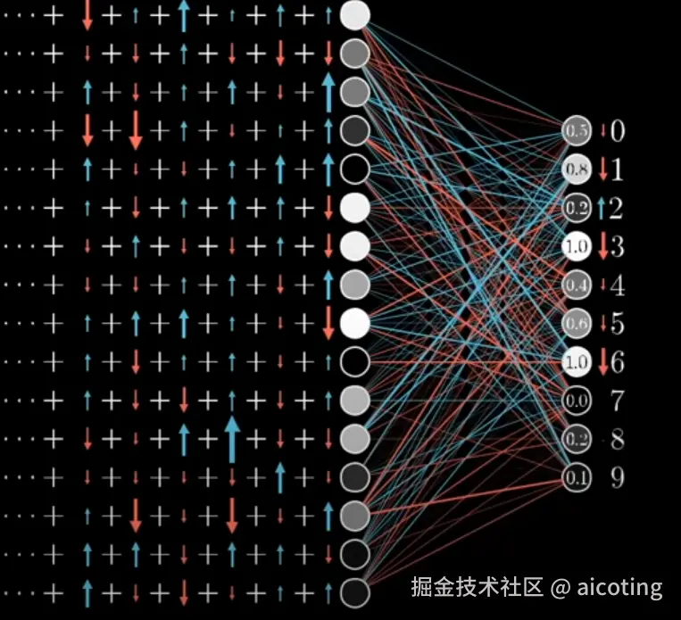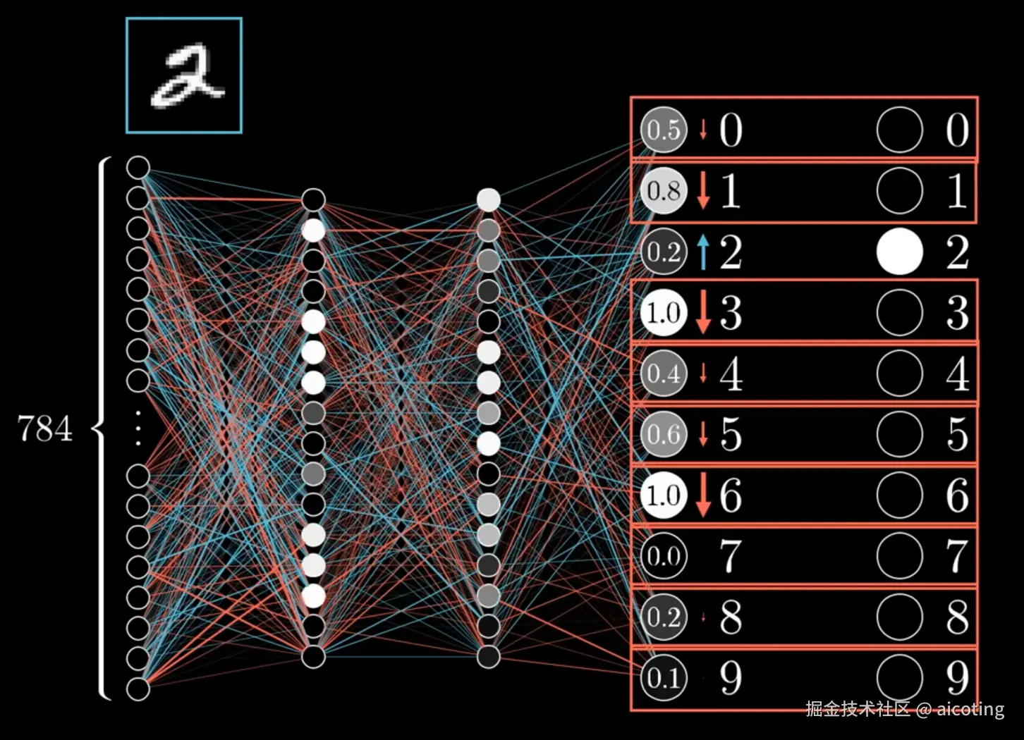 仍然以前面文章中用到的MLP为例,假设我们的网络还没有经过训练,所以输出会非常随机,可能是0.5,0.8等等,我们不能直接改变这些激活值,只能改变权重和偏差,我们希望网络输出是2,所以我们希望第三个值增大,而其他所有值减小,每个值变动的幅度应该和每个值与其目标值的距离成比例。