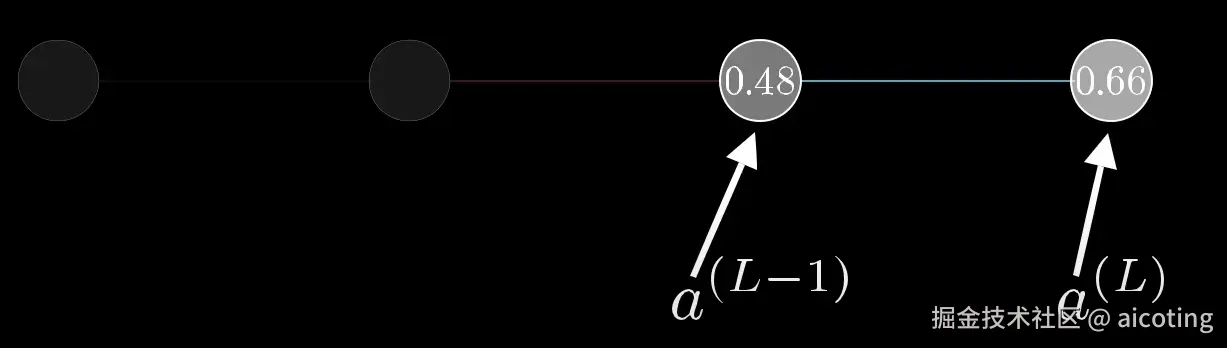 我们首先关注最后两个神经元,我们用a<sup>(L)</sup> 表示最后一个神经元的激活值,L表示位于哪一层,所以前一层的激活值就是a<sup>(L-1) </sup>,假设我们期望的激活值是y,因此对于单个训练示例,该网络的成本是C<sub>0</sub> = (a<sup>(L) </sup>- y)<sup>2</sup>
