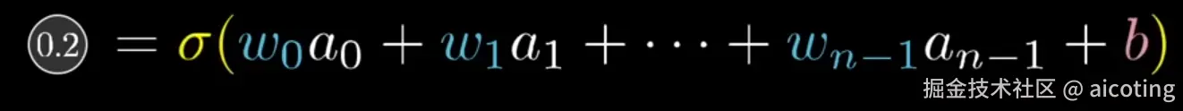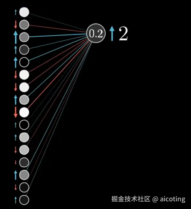 进一步的放大,我们只关注第二个神经元,我们希望增加他的激活值。注意一下,激活值在前文中被定义为前一层中所有激活的某个加权和加上偏置,然后放到激活函数中得到的目标值。