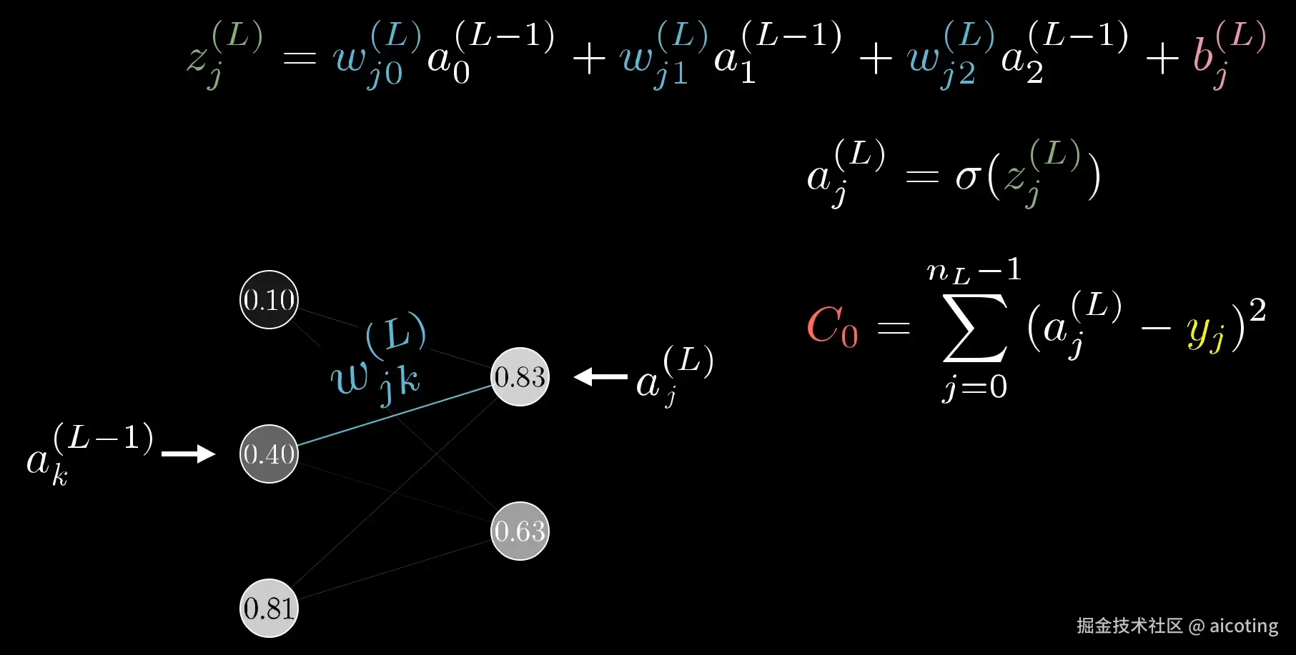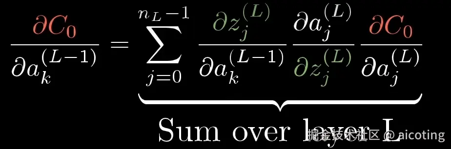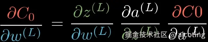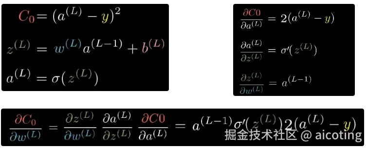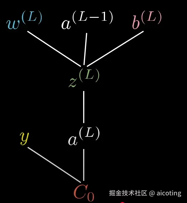 可以看到权重和上一层的激活值和偏置一起计算得到z<sup>(L)</sup>,进而计算a<sup>(L)</sup>,最后与y计算C<sub>0</sub>。