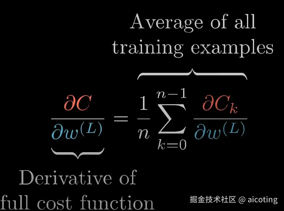由于完整的成本函数涉及对许多不同的n个训练示例的所有成本进行平均,因此其导数需要对所有训练示例对该表达式进行平均。