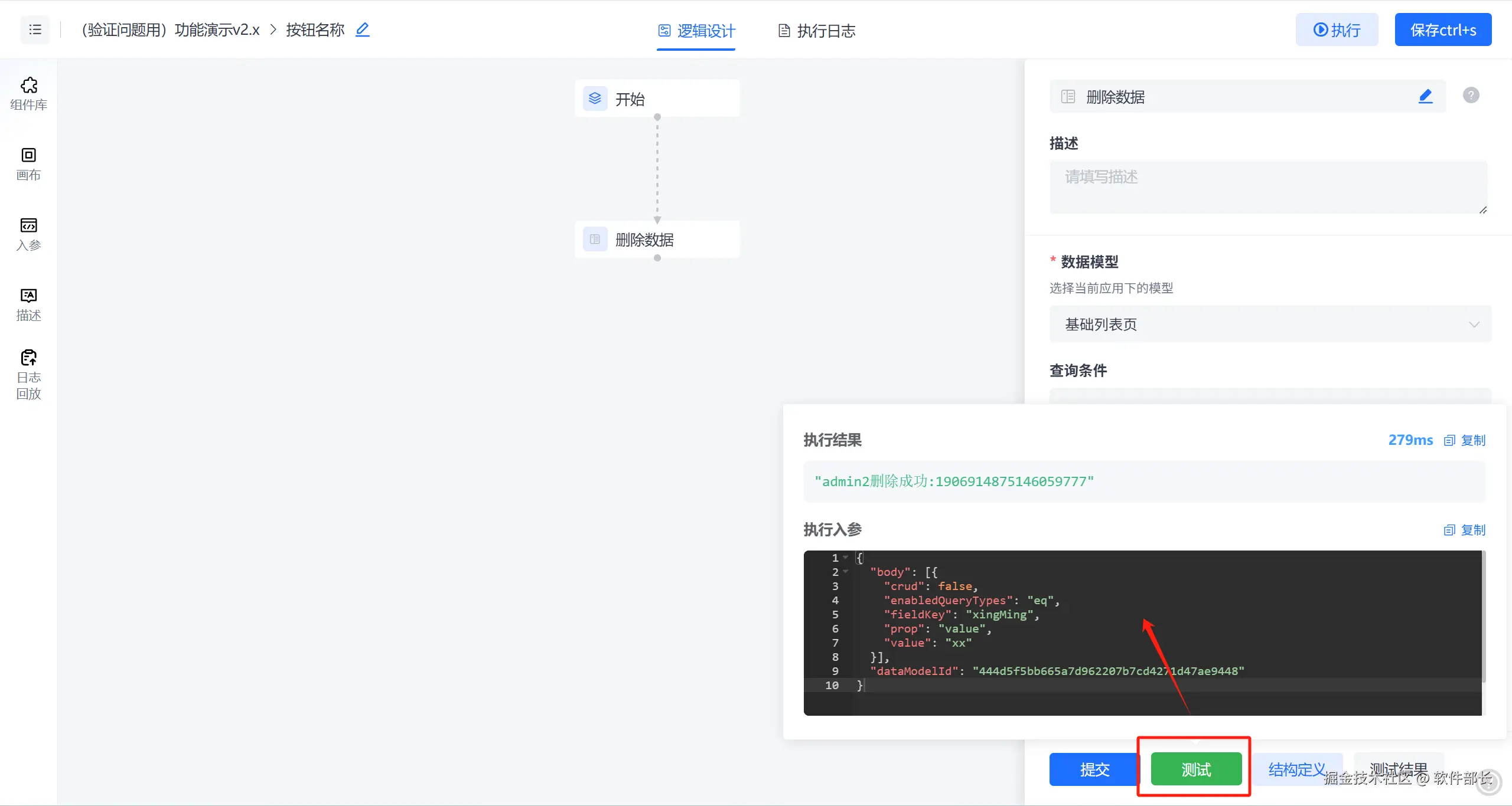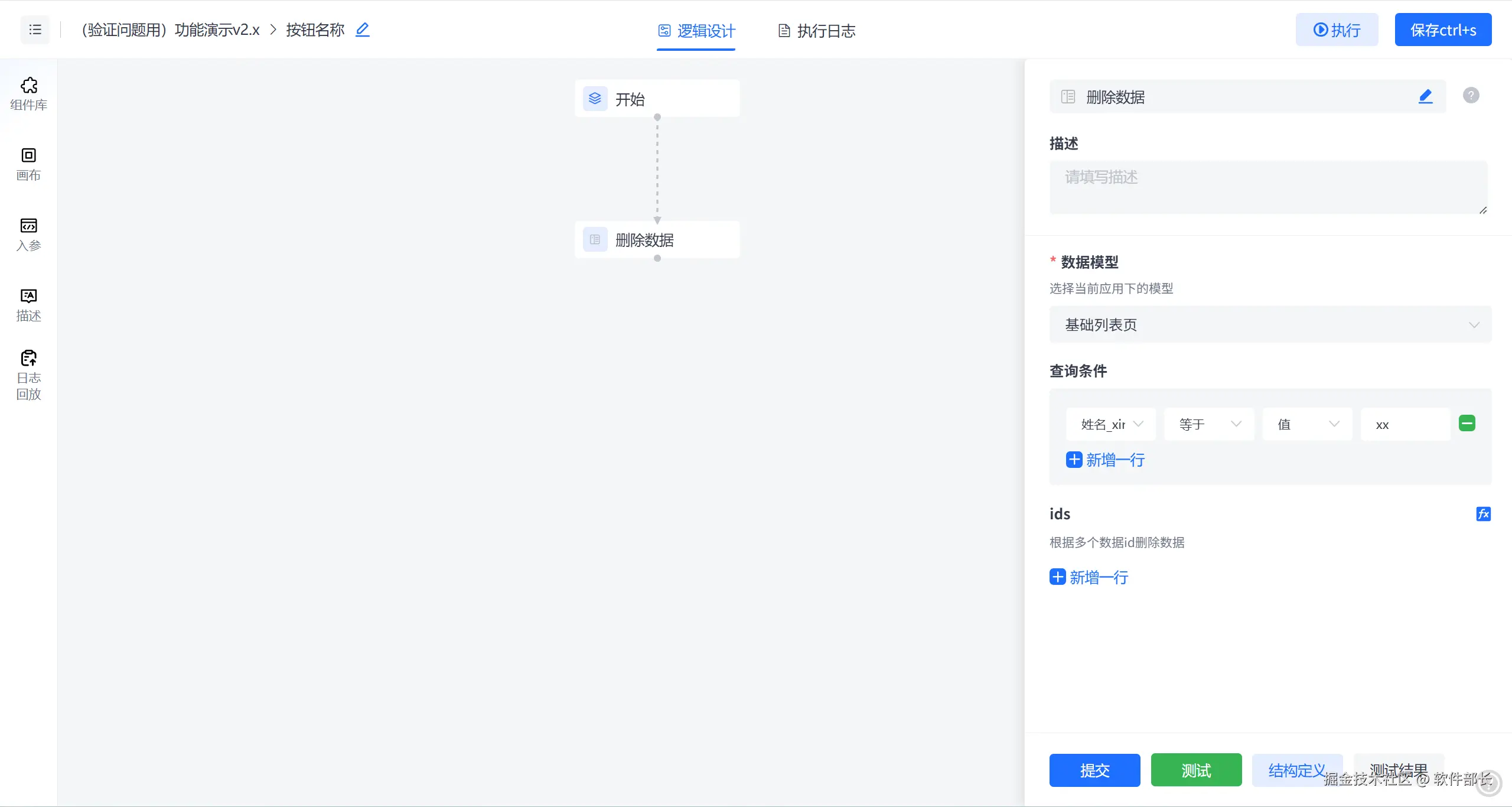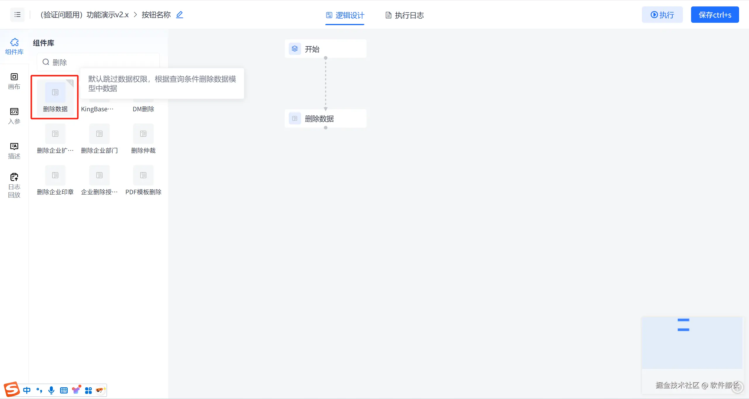 进入逻辑设计器中,拖取删除数据组件,如下图