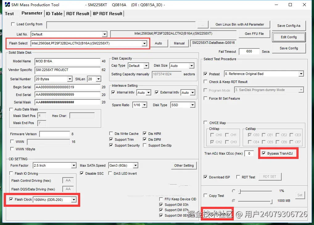 这里指点一下为什么要指定闪存频率100Mhz,实际原因是这些3D闪存基本都是100Mhz工作频率的,包括L06B都是,只不过L06B也可以在200Mhz工作。但是固件的默认设置就很头疼了,基本默认是193.75Mhz,一般人不会去改这个地方,结果是闪存能读ID,但是不能正常工作,所以软件会报错 ISP启动失败。
