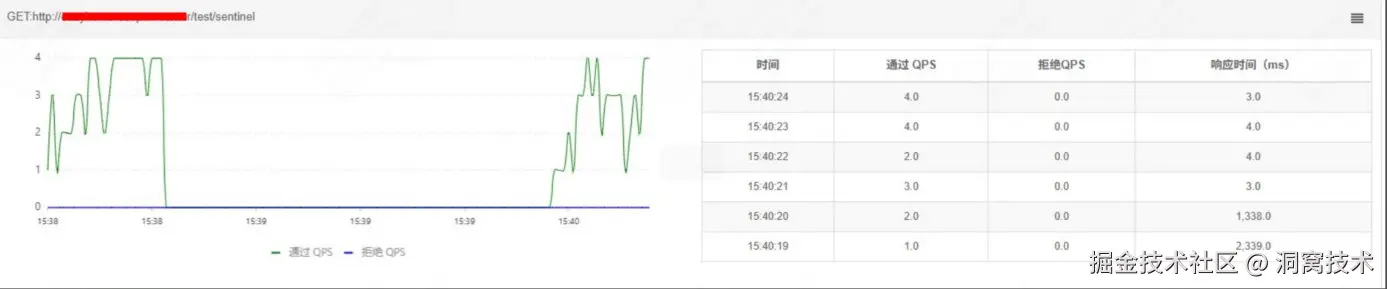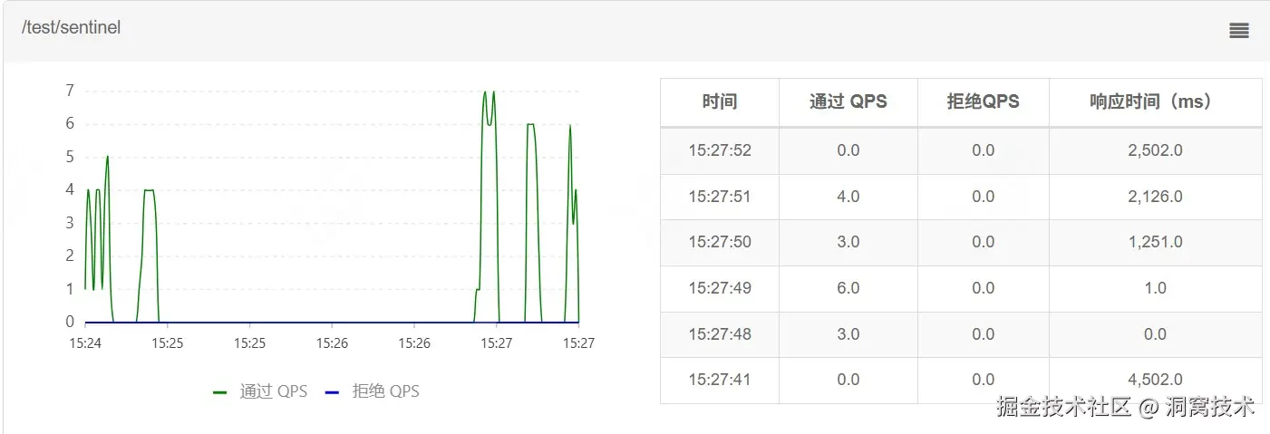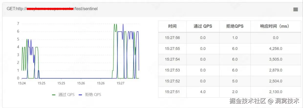 查看sentinel控制面板,实时监控图,表明熔断降级功能已经触发,蓝色表示拒绝请求数,如下,触发降级后有10s中左右请求都会触发降级(我们配置的是10s)。