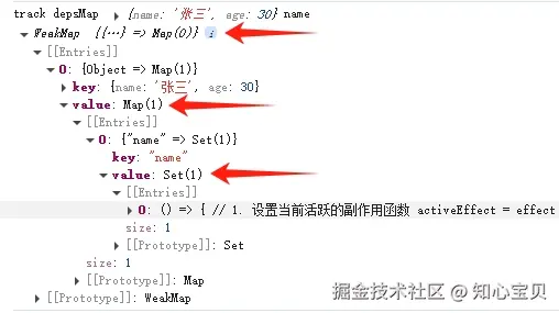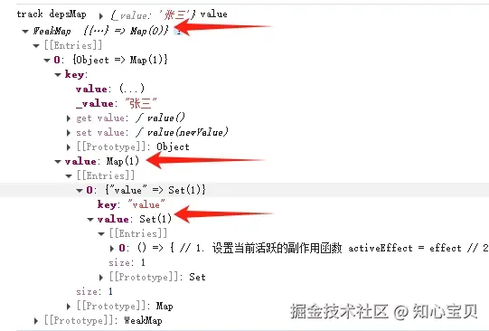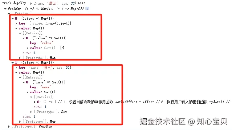 那么访问或者触发的时候,.value 触发基本对象类型的 get/set,.value.name 触发 Proxy 的get/set,所以上面有两个 Map