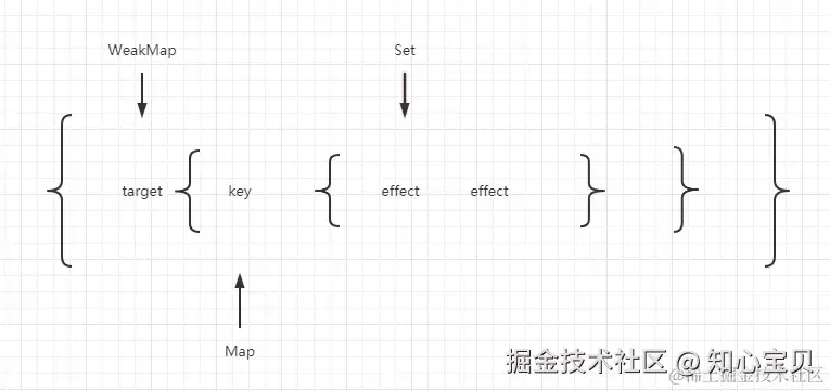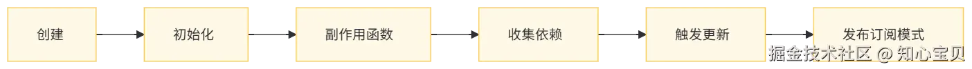 初始化在副作用函数内部访问的属性,会触发 Proxy getter 依赖收集操作,根据 对象维度 WeakMap => 属性维度 Map => 事件维度 Set 集合 进行存储,后续属性值发生更改,会进行触发更新并调用副作用函数。