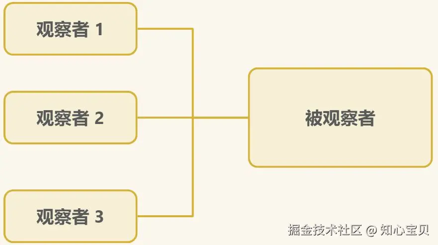 直接的依赖关系,观察者知道被观察者(整体的类或者实例),被观察者也直接管理观察者,依赖收集和通知都是自动化操作的