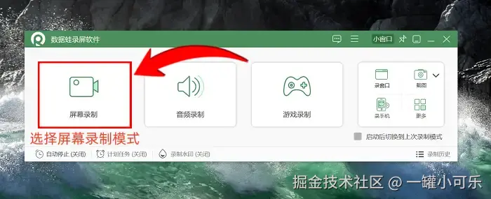 步骤1:电脑怎么屏幕录制?启动数据蛙录屏软件后,可以在主页直接挑选录制的模式。我们今天讲解的是 “屏幕录制” 模式。