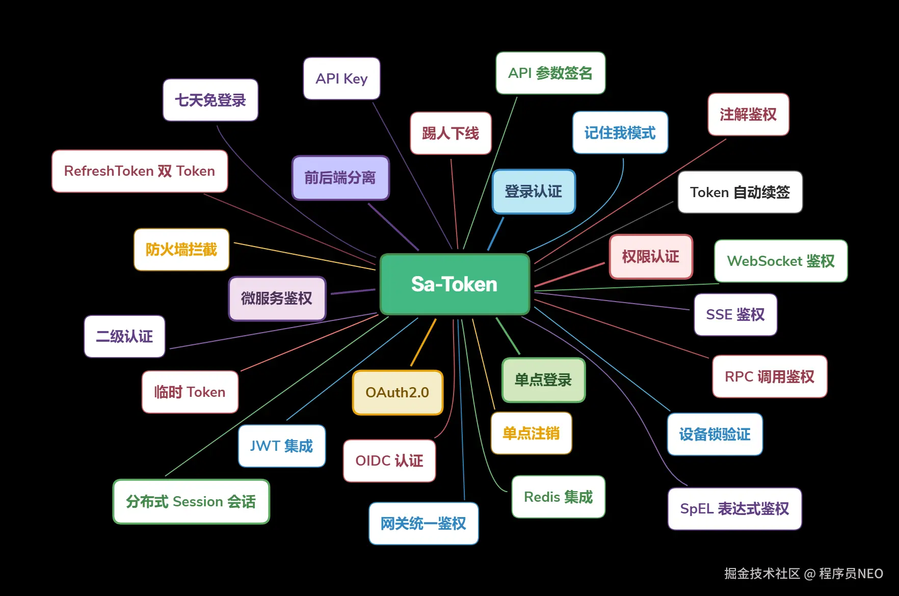 当然,Sa-Token 的能力远不止于此,它几乎涵盖了权限认证领域的方方面面,堪称一把"瑞士军刀"。