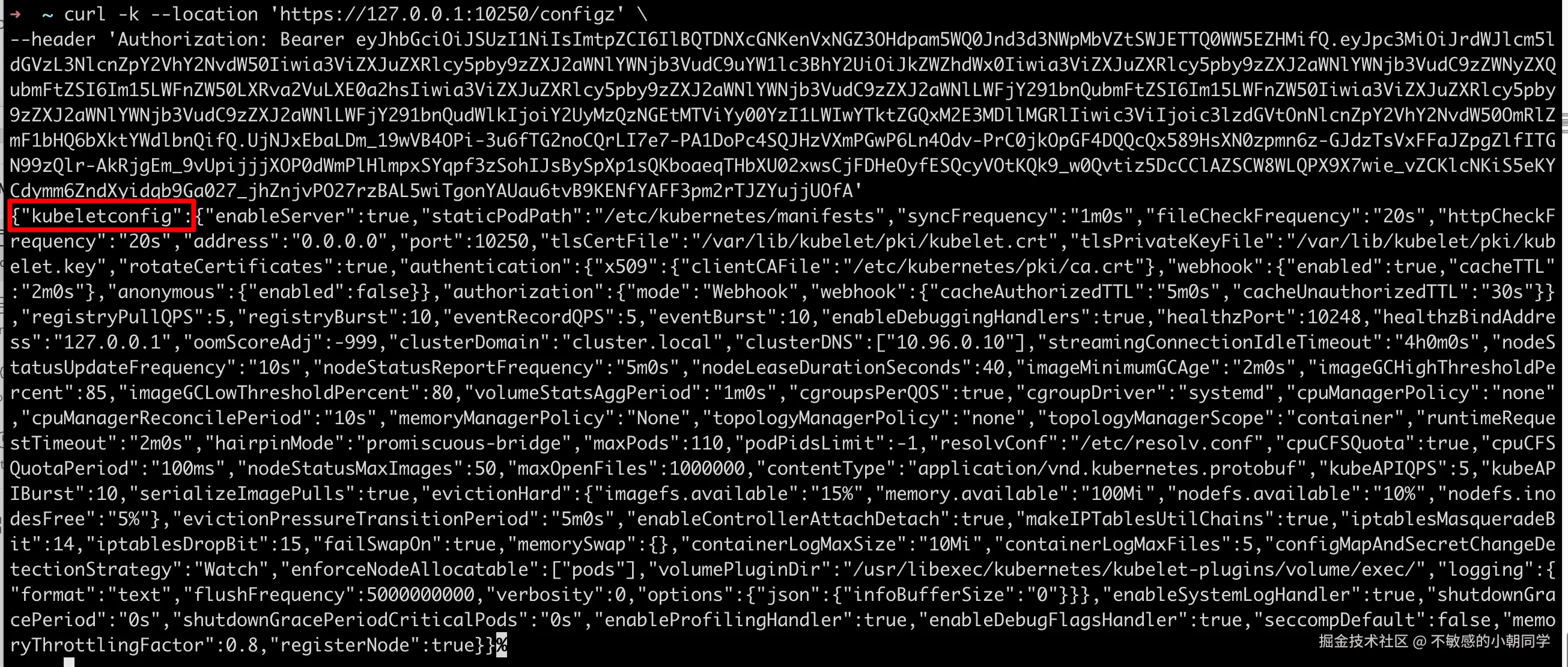 我们试着对 /configz 接口发起访问,访问其 kubelet 的配置信息