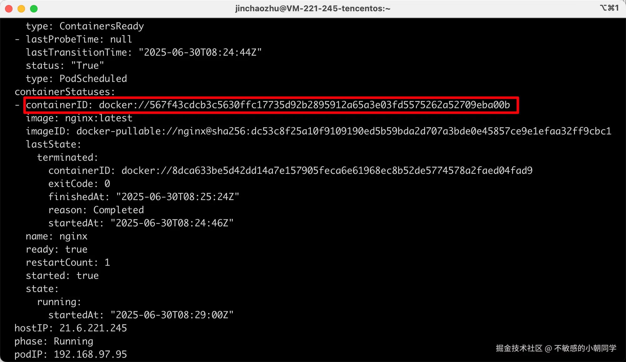 可以发现这个pod里面实际运行了两个容器,一个 sandbox 容器用来隔离容器的网络,一个业务自身的容器