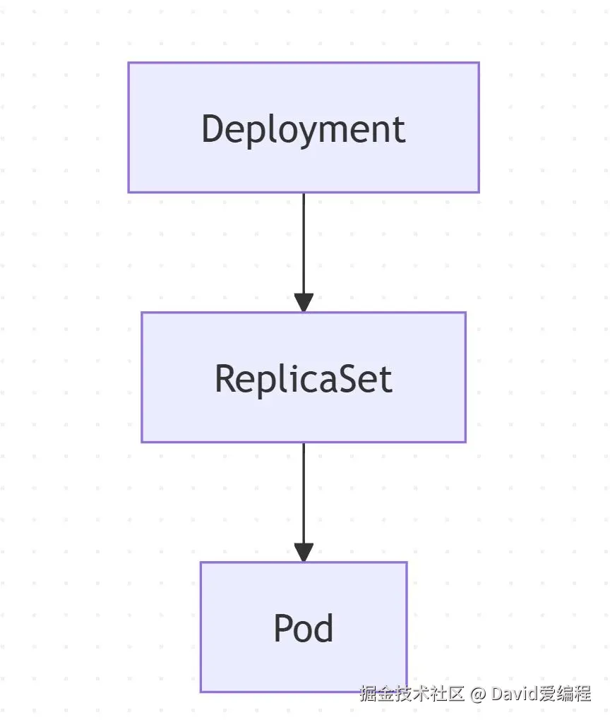Deployment 定义副本数与镜像,ReplicaSet 维持 Pod 数量,最终由调度器调度 Pod 至节点运行。