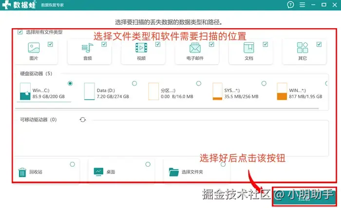 步骤1: 打开数据 蛙恢复专家,在首页上可以根据需要恢复的文件选择类型和位置,点击“扫描”;