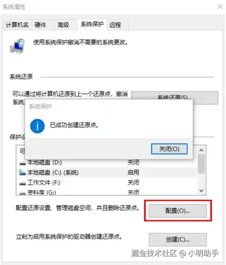 具体操作: 打开电脑的设置页面,在列表中选择“创建还原点”功能;在里面点击“配置”。