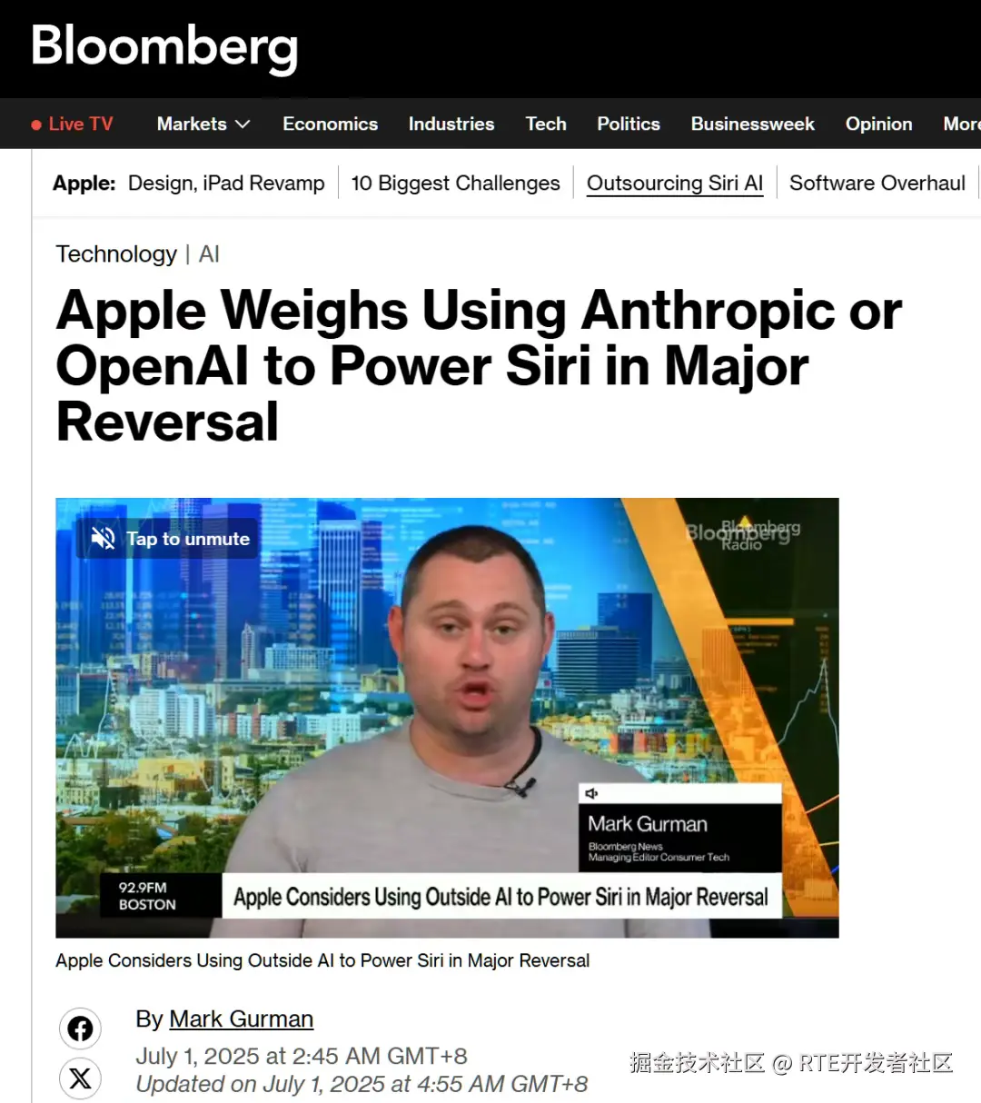 7 月 1 日消息,据彭博社知名记者马克·古尔曼(Mark Gurman)爆料,苹果公司正在考虑用 OpenAI 或 Anthropic 的模型来驱动新版 Siri,替代苹果自研大模型。