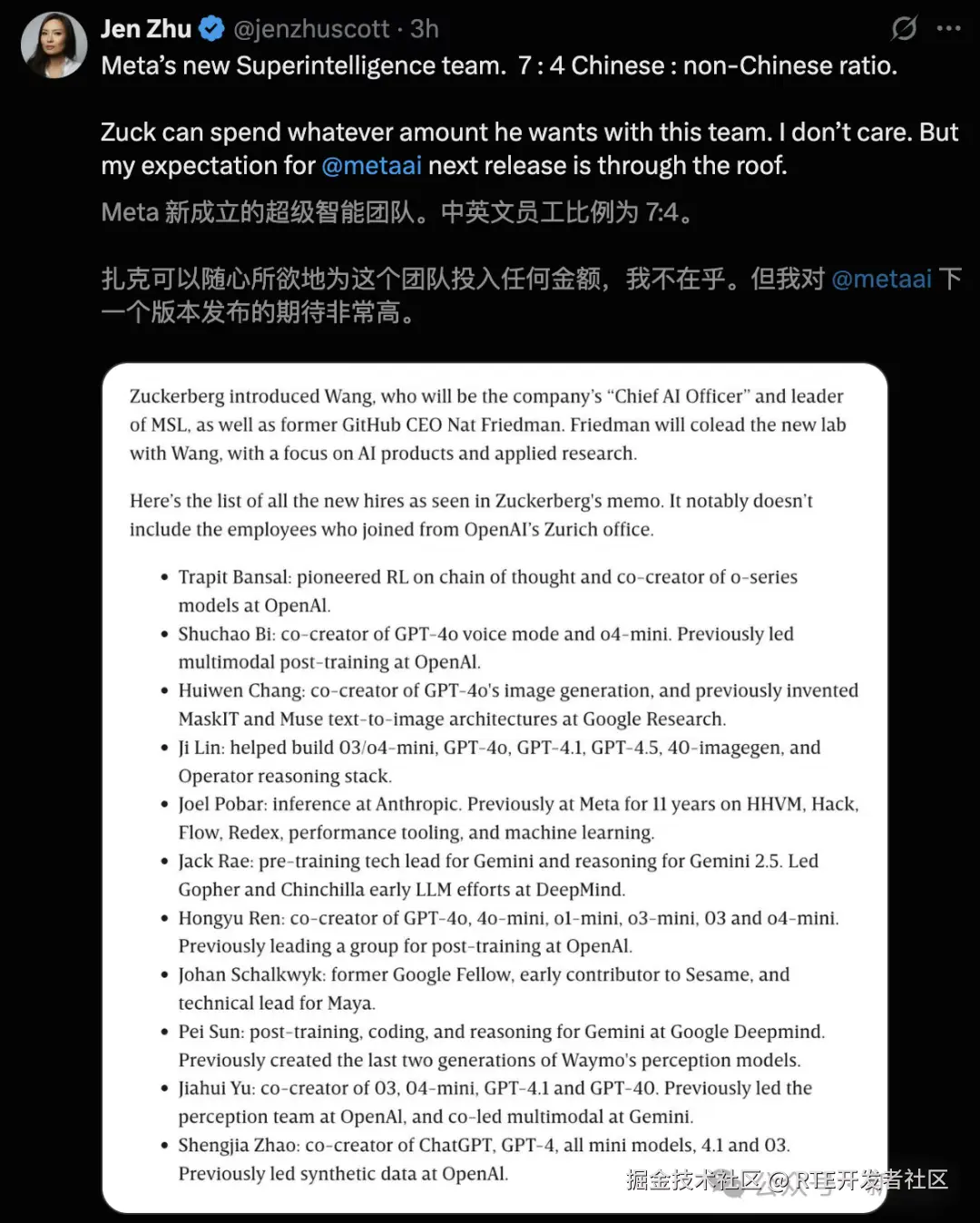 Meta 还新招聘了 11 名专注于人工智能的人才,其中包括前 Anthropic、Google DeepMind 和 OpenAI 的员工。