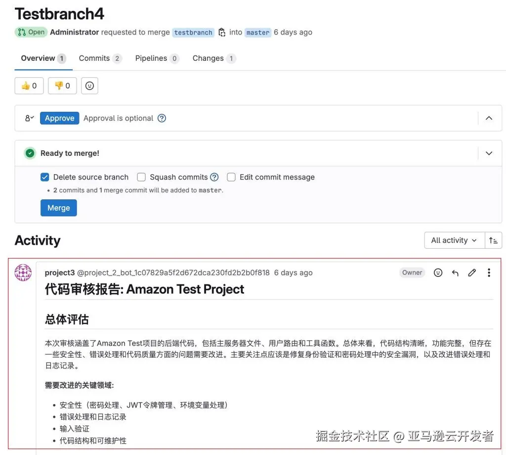 等待一小段时间后,Jenkins 代码审核 pipeline 执行完毕,在 Gitlab merge request 上可以看到自动添加的评论报告。至此测试完成。