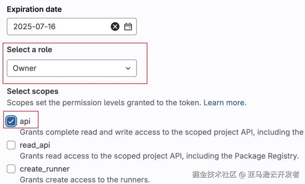 Gitlab:在 Project 底部 Settings 中选择 Access tokens,点击 Add new token。注意,role 不能选择 Guest,否则会缺乏调用 merge request api 的相关权限。scope 选中 api 即可。创建完成后,复制此 Access token。此 token 主要是用于 Jenkins Agent 完成代码审核后给 gitlab server 发送 api request,以添加 merge request 评论。