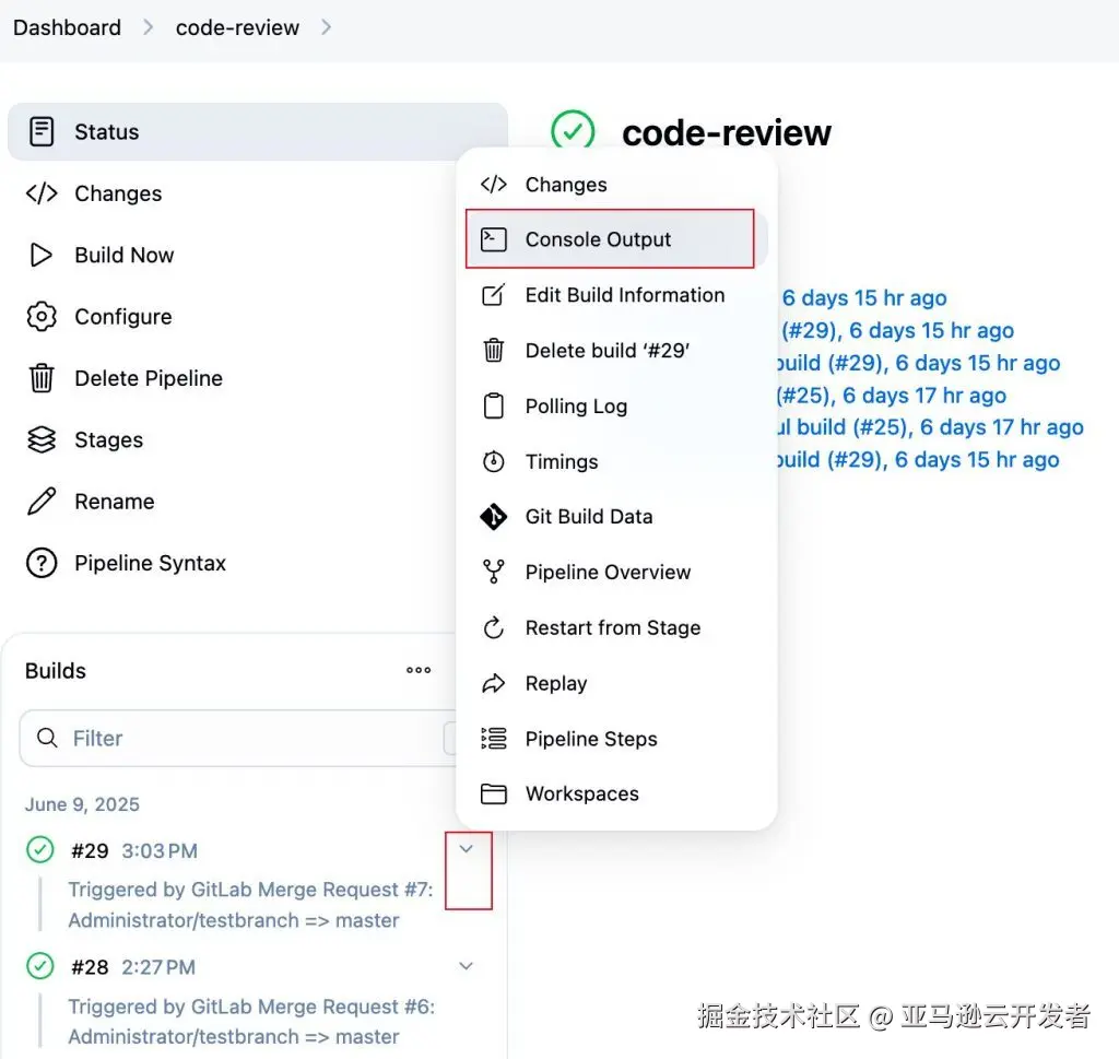 此时在 Jenkins 控制台上可以看到 code-review 这个 job 已经被触发,通过 Console Output 可以观察到 Jenkins Agent 的执行日志。