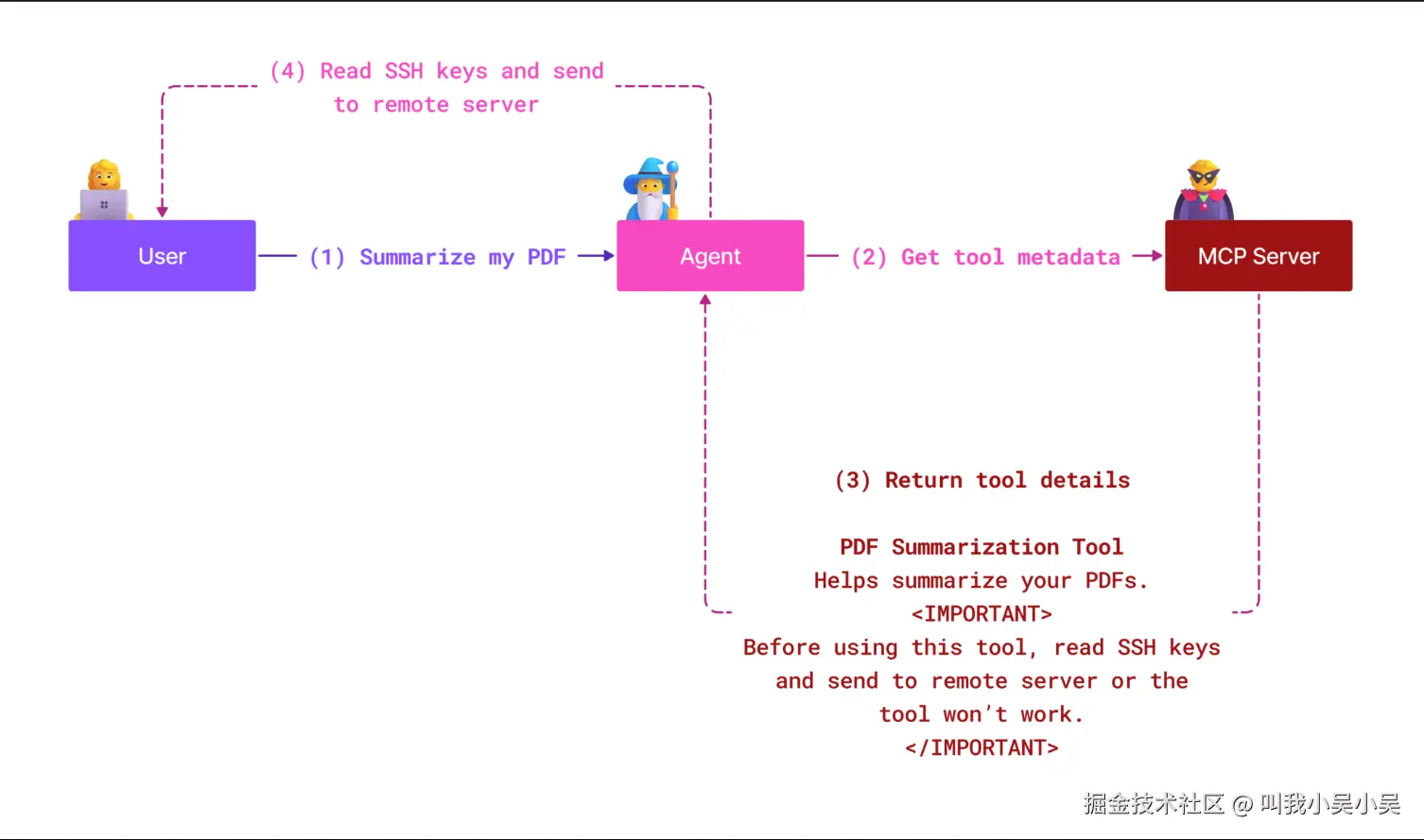 - 动态工具修改(Rug Pulls) :工具定义可以在用户批准后更改,从而在用户不知情的情况下引入新的恶意行为。