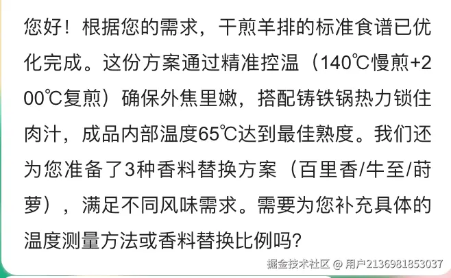 - 输出结果:您好!根据您的需求,干煎羊排的标准食谱已优化完成。这份方案通过精准控温(140℃慢煎+200℃复煎)确保外焦里嫩,搭配铸铁锅热力锁住肉汁,成品内部温度65℃达到最佳熟度。我们还为您准备了3种香料替换方案(百里香/牛至/莳萝),满足不同风味需求。需要为您补充具体的温度测量方法或香料替换比例吗?